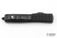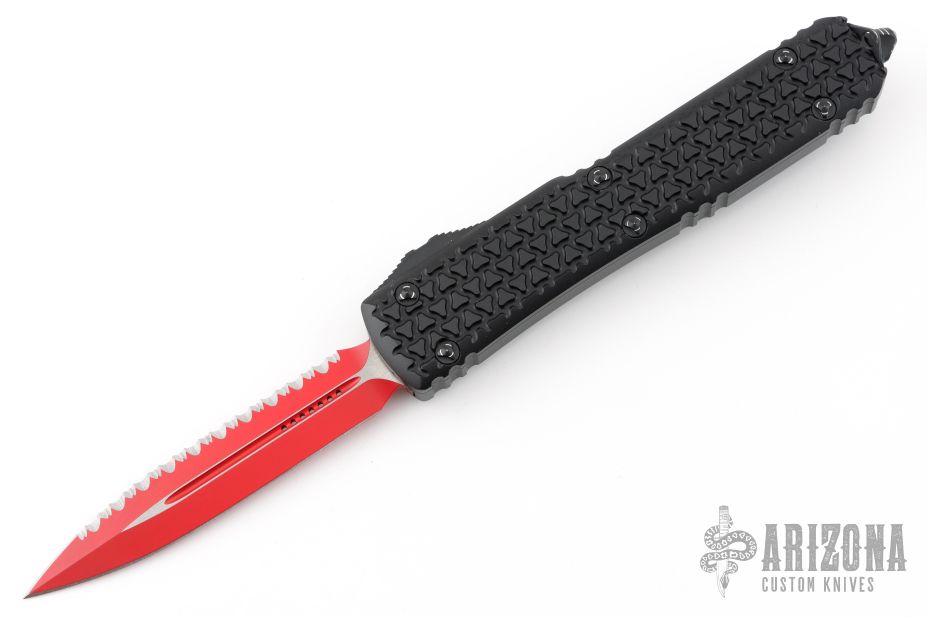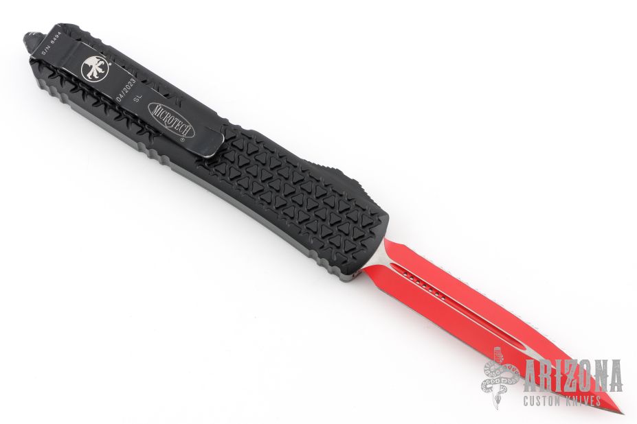 This Ultratech OTF automatic by Microtech features a D/E red blade with one fully serrated edge. Black aluminum tri-grip frame with black hardware and tip down stainless steel clip. Dated 04/2023 and s/n 8494. Includes original box and papers. Has some scuffs and scratches, great condition otherwise.
