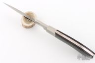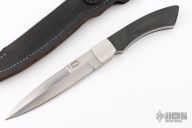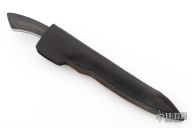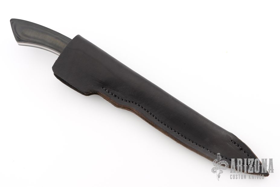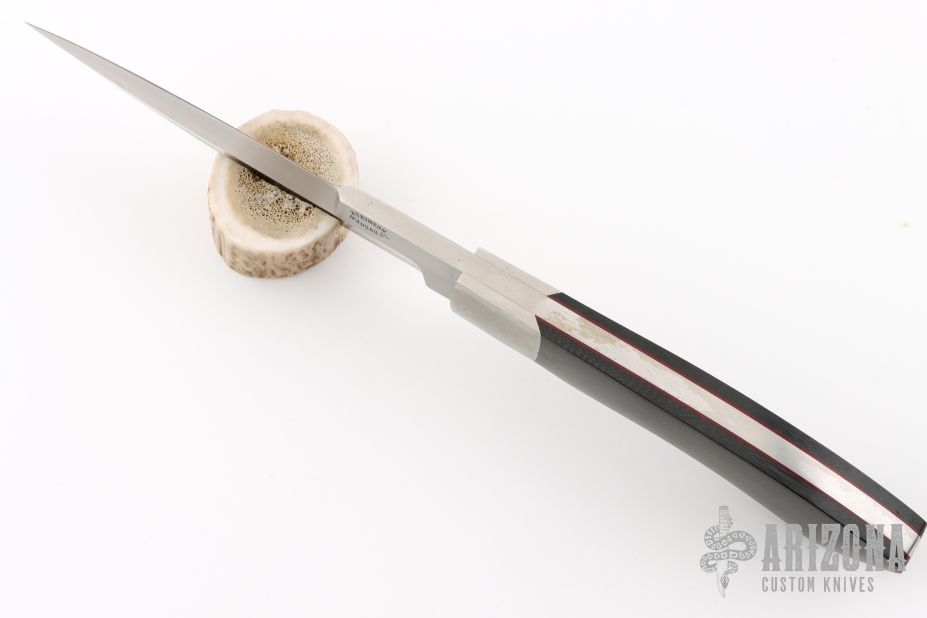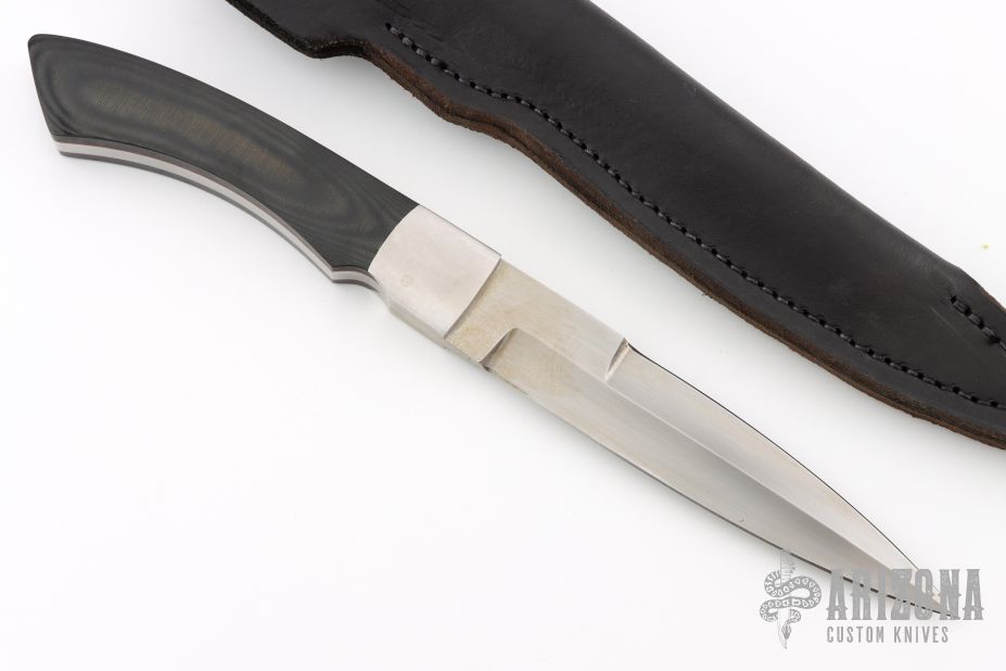 This Fighter by Dick Atkinson has a hand rub satin finished double edged blade with .255" blade stock, 1.154" depth, full tang construction. The handle has dovetailed stainless steel bolsters, black linen micarta scales with red liners. Comes with a black leather sheath. Has some light oxidation on the blade, otherwise good condition.