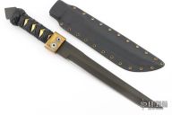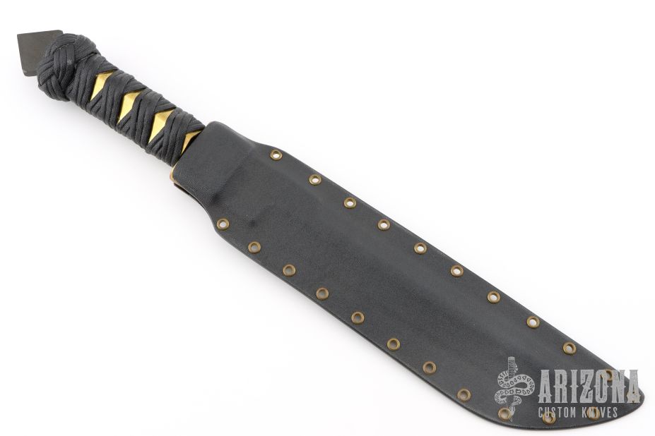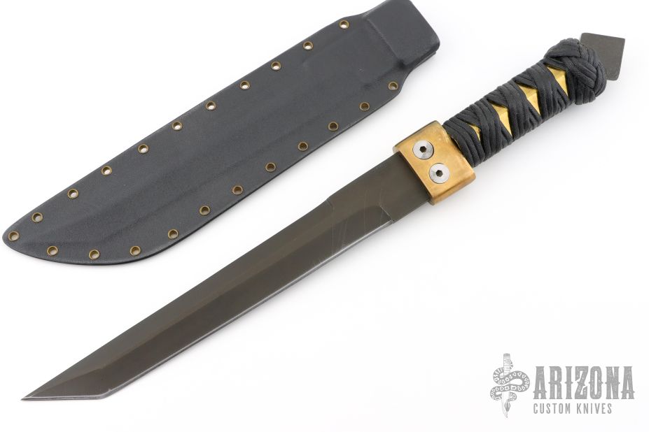 This Large Tanto by Mineral Mountain Hatchet Works features a black blade with false top edge, .216" blade stock and 1.408" blade depth, full/hidden tang construction. The handle has a brass guard, brass square tube grip with epoxied paracord wrap. Has some light scuffs, otherwise excellent condition. Comes with Kydex sheath.