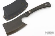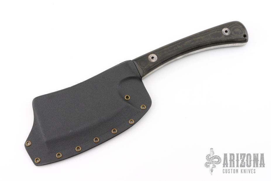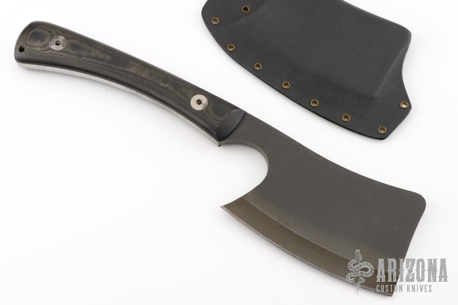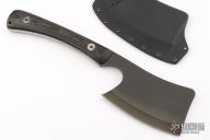 This All Purpose Cleaver by Mineral Mountain Hatchet Works features a black .321" thick blade and tang with 3.25" blade depth, black linen micarta scales. Has some light oxidation on the tang and blade spine, otherwise excellent condition. Comes with a kydex sheath.