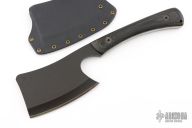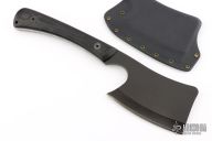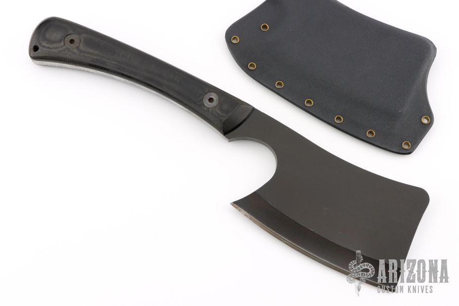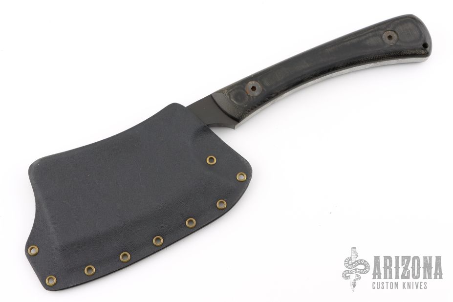 This All Purpose Cleaver by Mineral Mountain Hatchet Works features a black .320" thick blade and tang with 3.25" blade depth, black linen micarta scales. Has some light oxidation on the tang and blade spine, otherwise excellent condition. Comes with a kydex sheath.