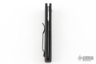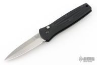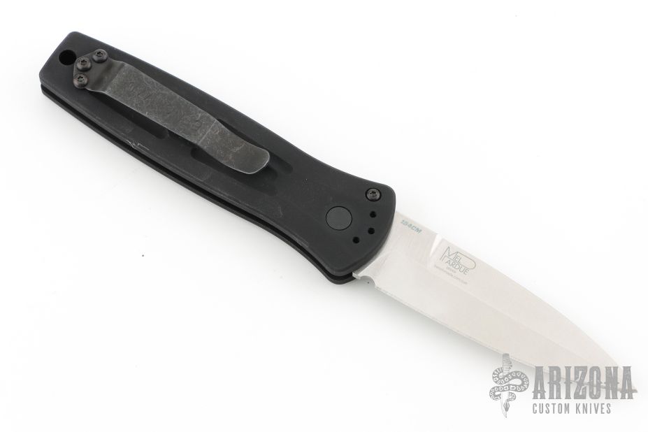 This 3551 Mini Stimulus features a stonewashed spear point blade with false top edge and a black aluminum handle with push button and safety, tip up or down reversible black stainless steel clip, lanyard hole at the butt. Has some scratches on the clip, Excellent condition. Comes with original box, pouch, and papers.
