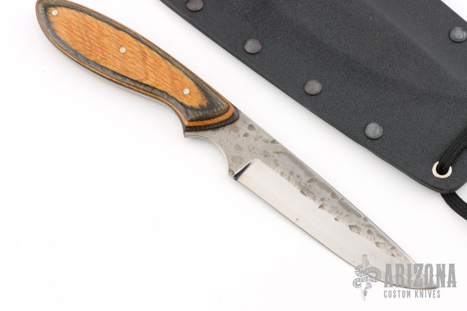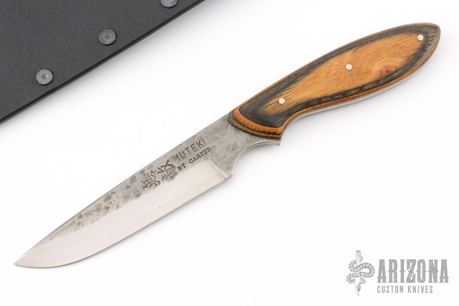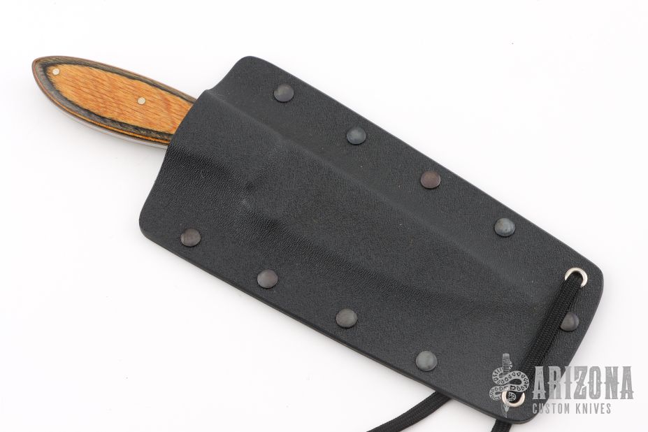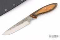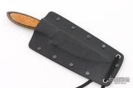 This Knife by Master Smith Murray Carter, features a two-tone San Mai blade .116" Blade Stock, .947" Blade Depth.  The handle has dymondwood scales and nickel silver pins over a full tang construction. Comes with a kydex neck sheath. Has some light scratches, otherwise excellent condition.