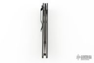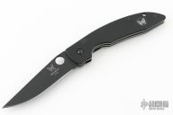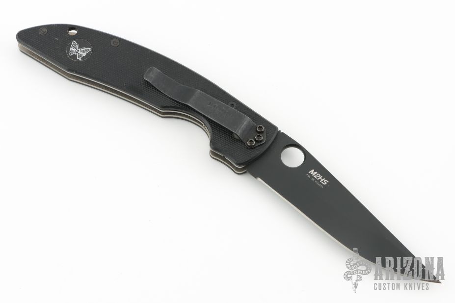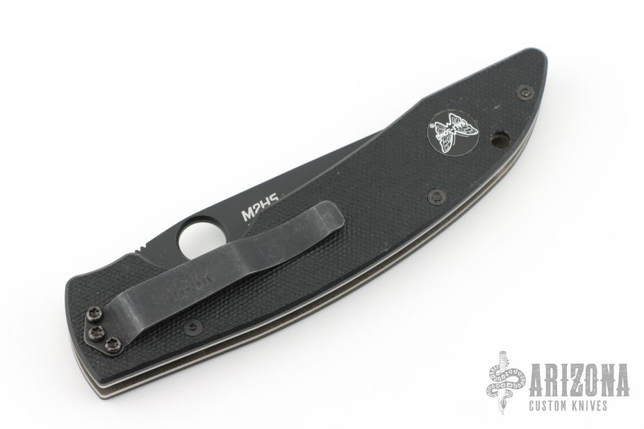 This 800HS Linerlock folder by Benchmade has a black blade with thumb hole, and notched thumb rest. Handle is black G10 over titanium liners, black fiber back spacer, lanyard hole, and black stainless steel tip down clip. Comes with original box and papers. Has some scratches on the clip, excellent condition otherwise. M2HS.