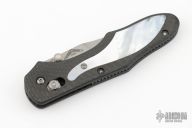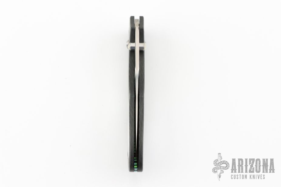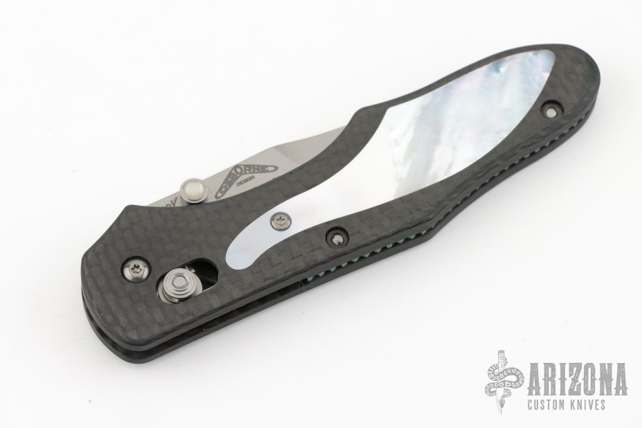 This 960 axis lock folder by Benchmade is a Warren Osborne design, it features a drop point satin finished blade with dual thumb studs. The handle hascarbon fiber covers, with notched green backspacerm and pearl inlays. Limited Edition #64/100. Comes with original box, deluxe box, papers dated 5/4/2003. Excellent condition.