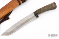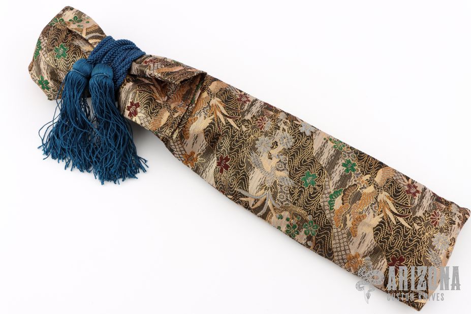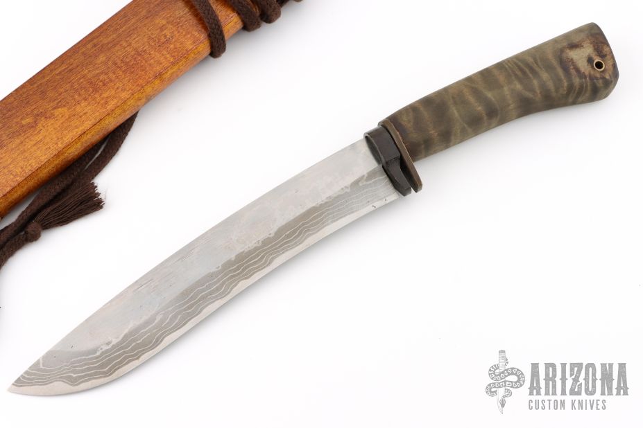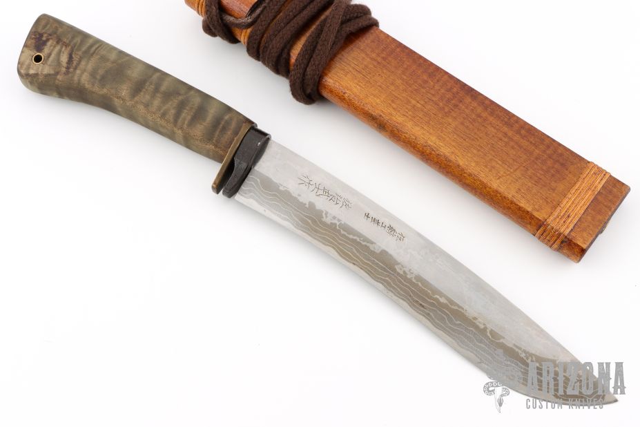 The KenNata is a hunting knife made for heavy work outdoors. The blade is San Mai Damascus and has .219" blade stock and 1.564" blade depth, hidden tang construction. The handle has a black steel guard with a brass guard underneath, curly wood grip (maple?), brass lanyard tube. Comes with a wooden saya/scabbard. Has some light scratches and patina, otherwise good condition. Comes with a silk sword bag.