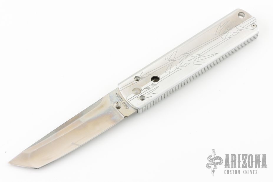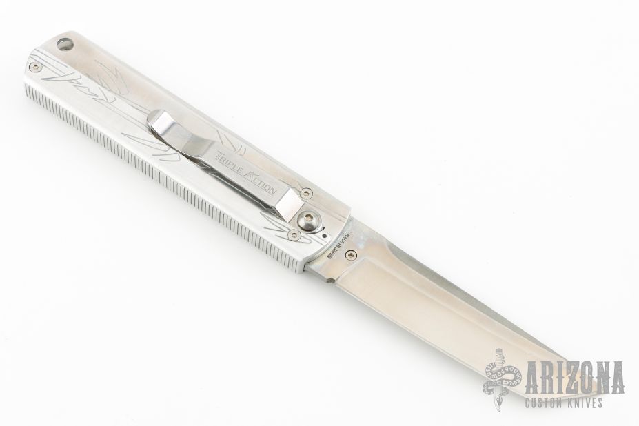 This Triple Action by Cold Steel features a satin finished blade with single thumbstud. The handle has an aluminum frame that houses the blade. Has a tip down pocket clip. Has a couple light scratches, otherwise excellent condition. Comes with original box.