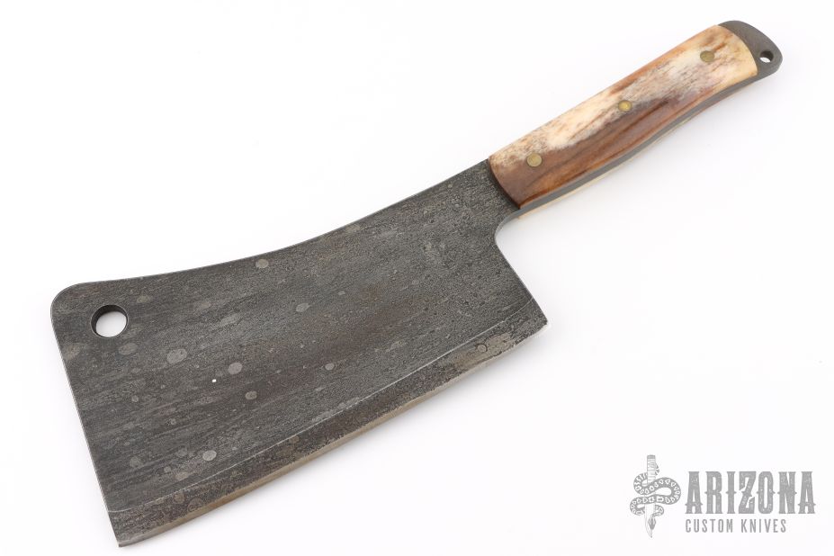 This Cleaver by Ricky Fowler features a forge finished blade with .249" blade stock and 4.75" blade depth, full tang construction. The handle has giraffe bone scales and brass pins. Excellent condition.