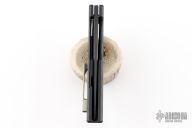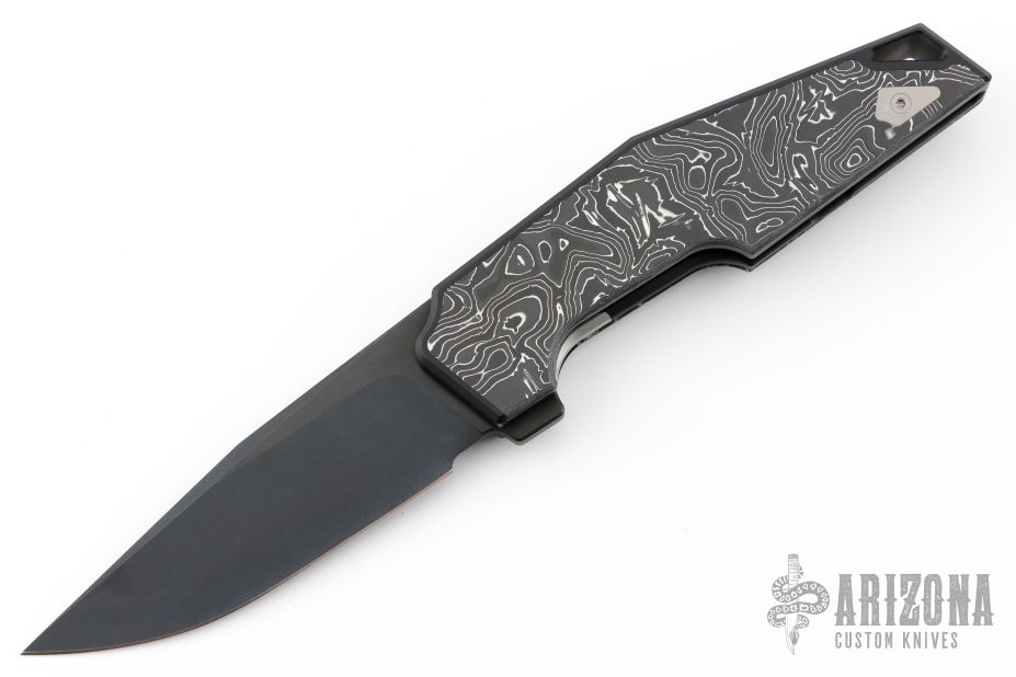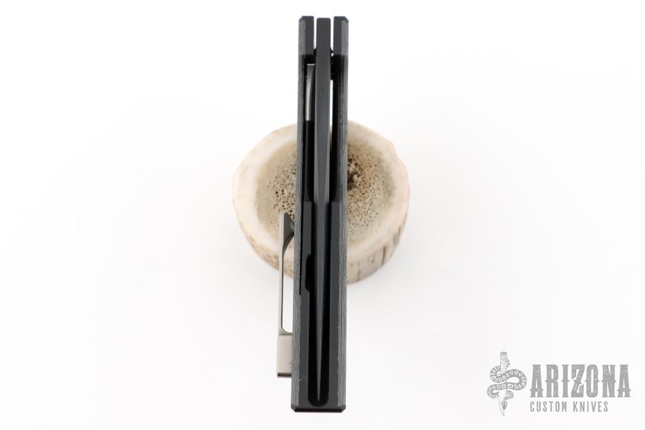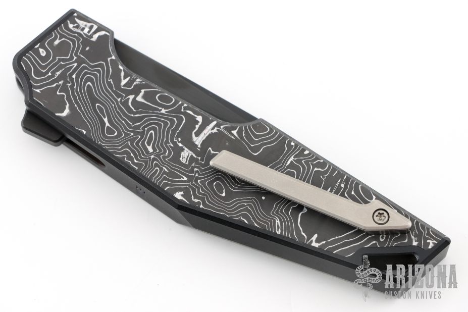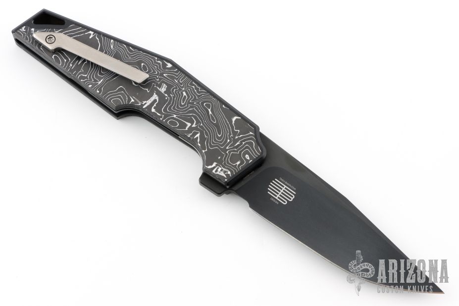 This knife by WE knife company is a Tashi Bharucha Design. It has a black blade, and black integral handle with inlaid carbon fiber scales. Has bead blast finished lock face insert, and tip up clip. Comes with original box and zipper case. Also includes extra clip. Has a couple light scuffs, excellent condition otherwise.