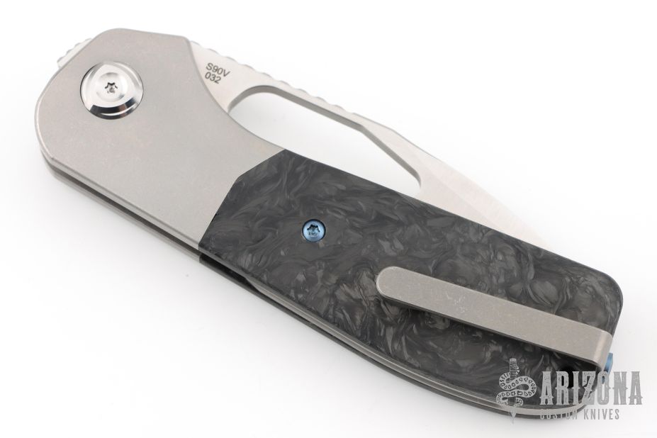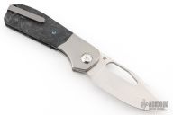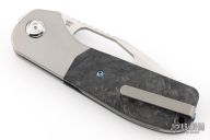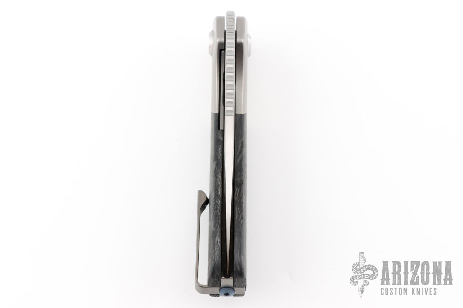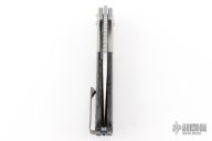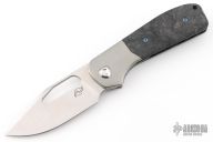 This Field Duty by Reate is a Liong Mah design, it features a satin finished blade with notched thumbrest and a thumb hole. The handle has a blasted titanium frame with marble carbon fiber scales, titanium backspacer and tip up clip, lanyard pin. Comes with original Velcro case and packaging. Has a couple light scuffs otherwise excellent Condition.