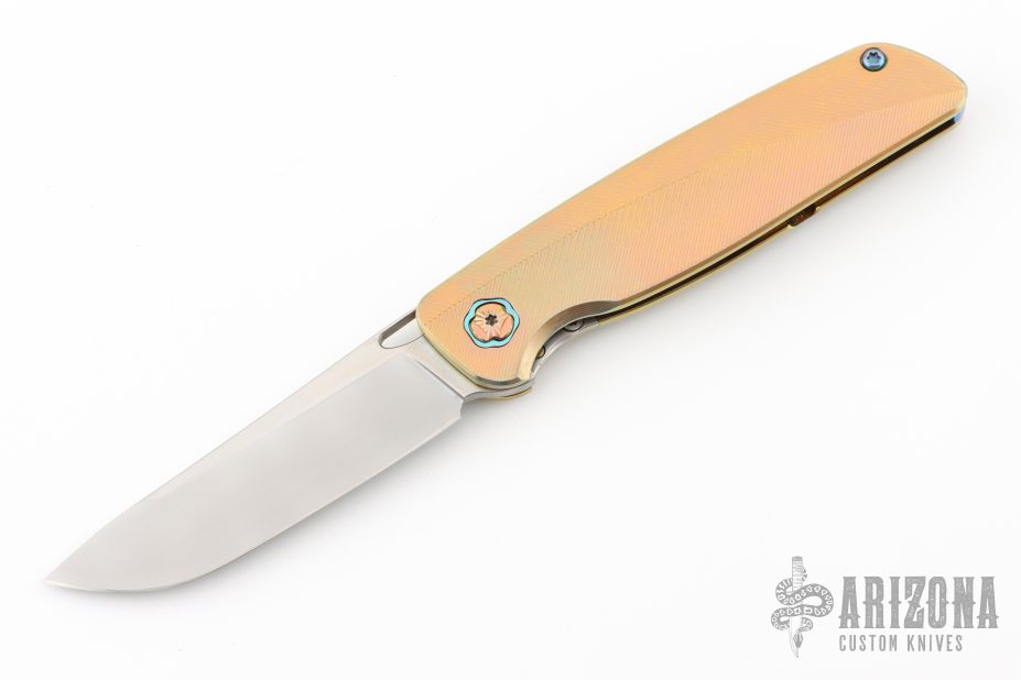 This Cypress by Robjohnsons features a two-tone finished blade with thumbhole, notched thumbrest and flipper. The handle has a milled and anodized titanium frame with anodized titanium backspacer and tip up clip with hidden screws. Rides on bearings, nice detent, lockup and blade seating. Excellent condition.