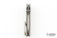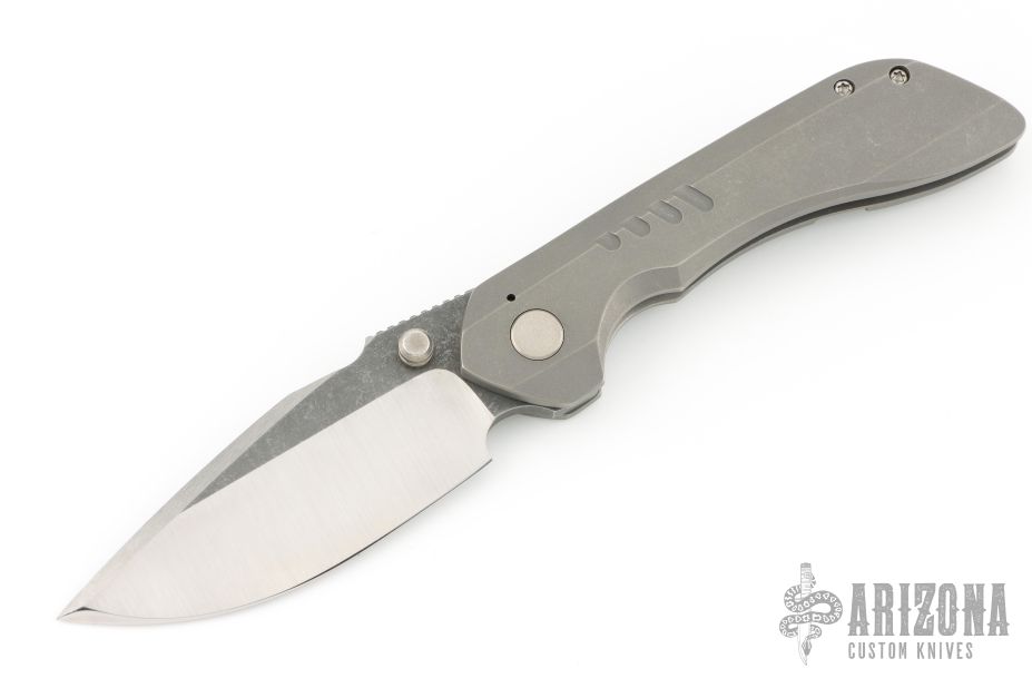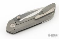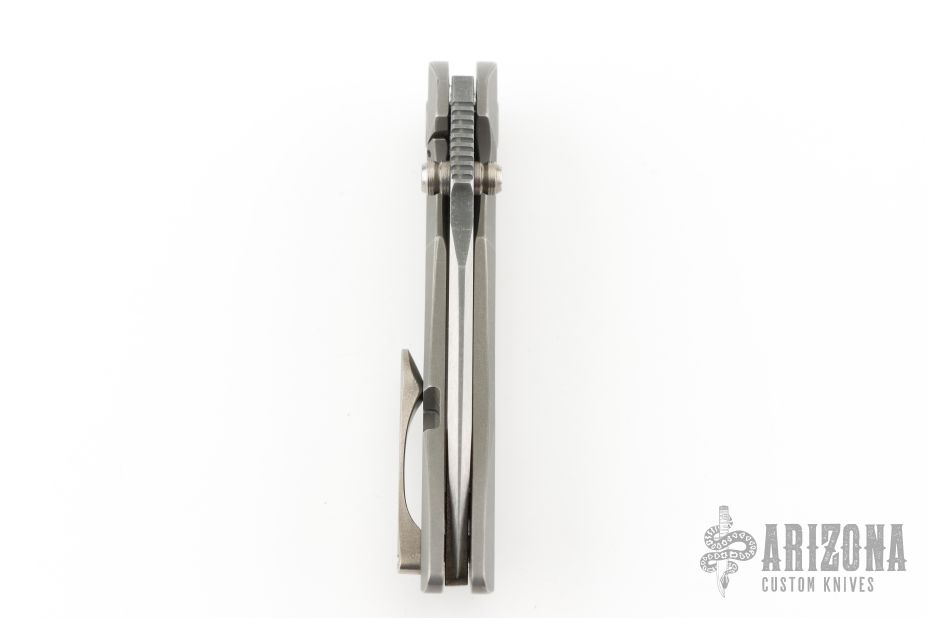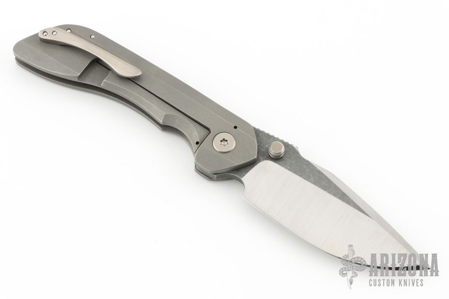 This Reign by Steve Dumchus features an acid etched and satin finished blade with notched thumbrest and dual orange peel thumbstuds. The handle has titanium frame, pivot, backspacer, and tip up clip. Nice detent, lockup and blade seating. Excellent condition. Comes with COA dated 02/22 and zipper case.