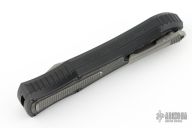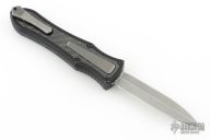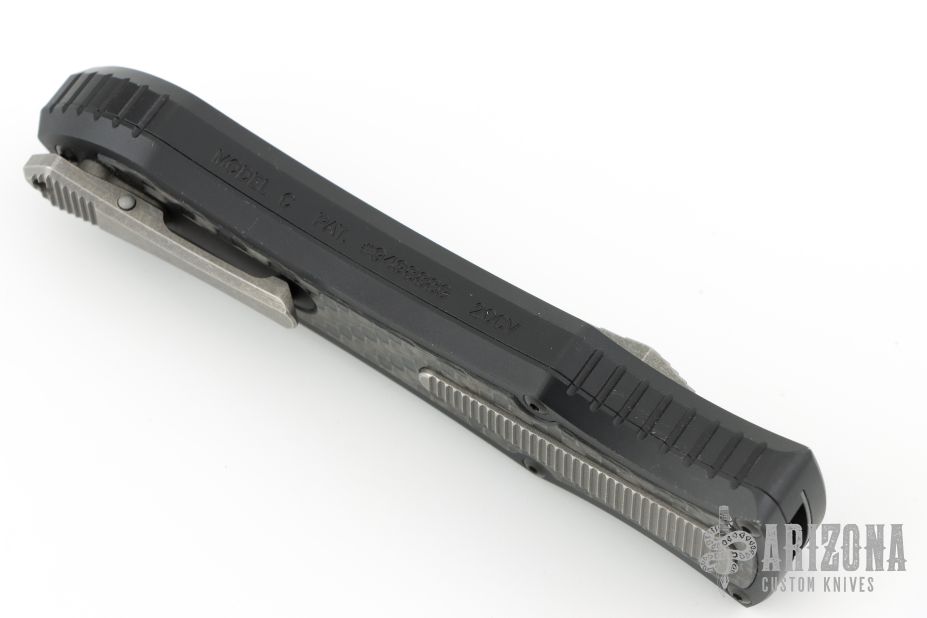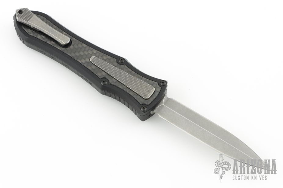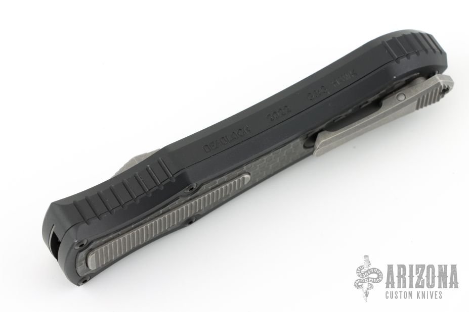This knife is a Deadlock Model C by Grant and Gavin Hawk. It has a double-edged stonewashed blade. The handle has carbon fiber inlays in the black aluminum frame with a tip down spring clip, titanium. The thumb slide on the handle is also titanium and handle has a carbon fiber overlay.  Grant and Gavin Hawk set out to create a double action OTF with no blade play.... They did it, NO blade play. Has a couple of marks on the aluminum frame, otherwise excellent condition.