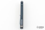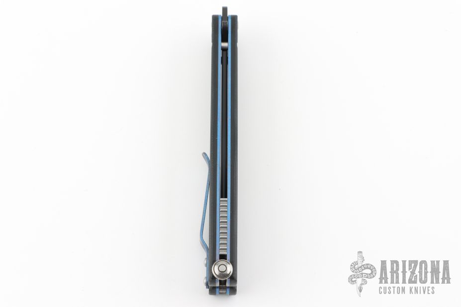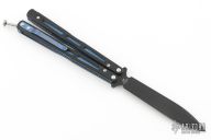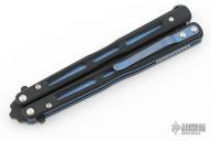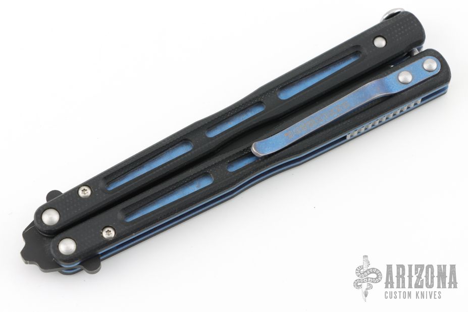 This Model 51 Morpho Balisong from Benchmade has a black finished D2 stainless steel spear point blade. Handle is black G10 with blue jeweled/ anodized titanium liners and blue anodized titanium tip up clip. Comes with original box and papers. Has a couple light scuffs, otherwise excellent condition.