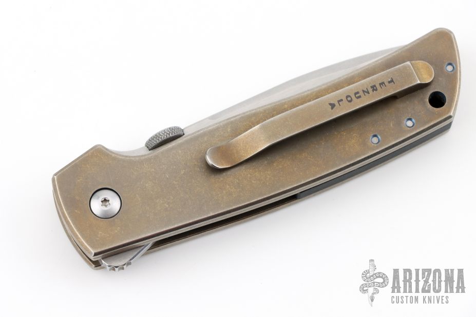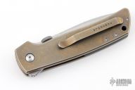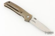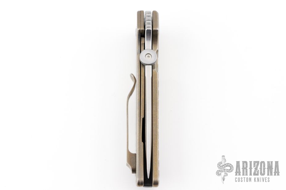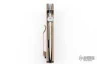 This Mid-Tech by Bob Terzuola features a tumble/satin finished spear point blade with swedge, notched thumbrest, flipper and a thumb disc. The handle has anodized and tumbled titanium scales with frag pattern, a single anodized and tumbled titanium liner, copper backspacer and tip up titanium clip with hidden screws. Nice detent, lockup and blade seating. Rides on bearings. Comes with a zippered case and signed card. The blade is signed "Bob T. #1". Has a couple light scuffs, otherwise excellent condition.