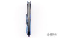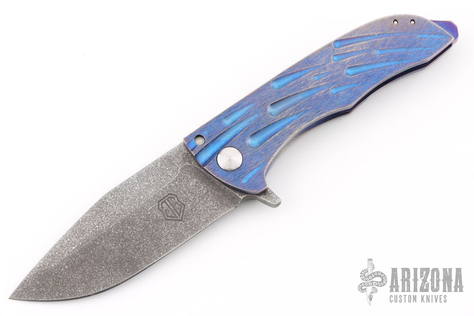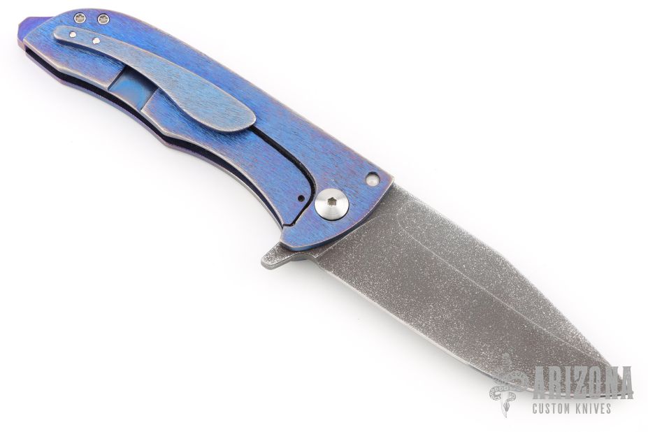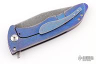 This Splitter from John Gray Knives features an acid rain finished clip point blade with large fullers and a flipper. The handle has a bark finished and anodized titanium frame with matching tip up clip and backspacer. Nice detent and lockup. Excellent condition.