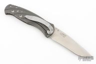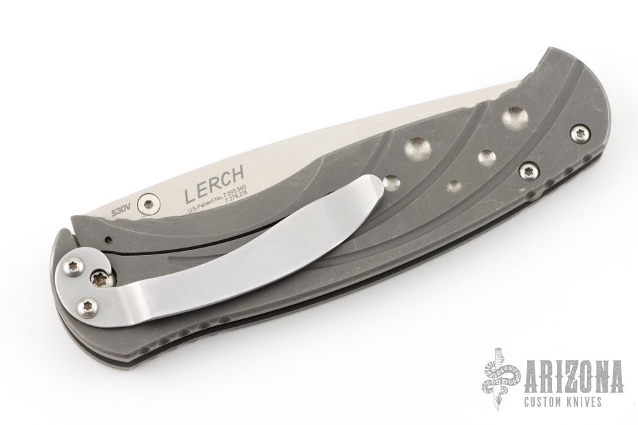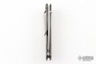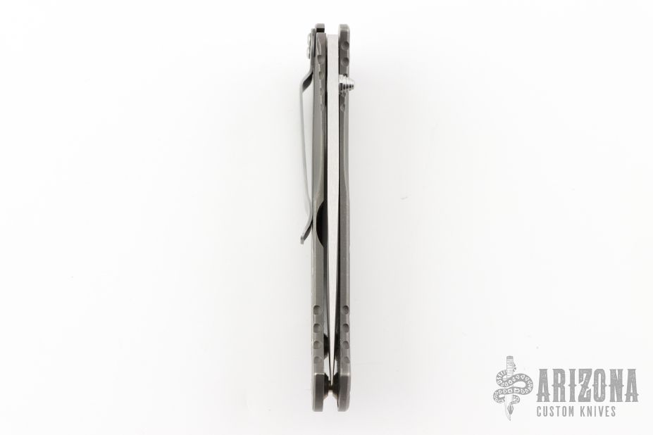The Subrosa is a collaboration project between Ken Steigerwalt and Matt Lerch. They have patent pending status on this mechanism. They sold the manufacturing rights to Benchmade, who produces factory versions utilizing this mechanism. The key elements that make this assisted mechanism a cut above are the two titanium leaf springs connected together with a hardened roller that engages on the blade. Because the roller follows the blade during the opening and closing motion, there is little to no wear to the components. Tumble finished S30V stainless steel drop point blade with single thumb stud. Milled titanium frame with titanium barrel-type spacers, and bead blasted stainless steel tip down clip. Has scuffs and scratches, has been used, good user condition.