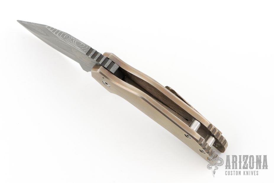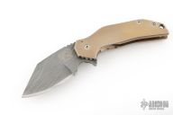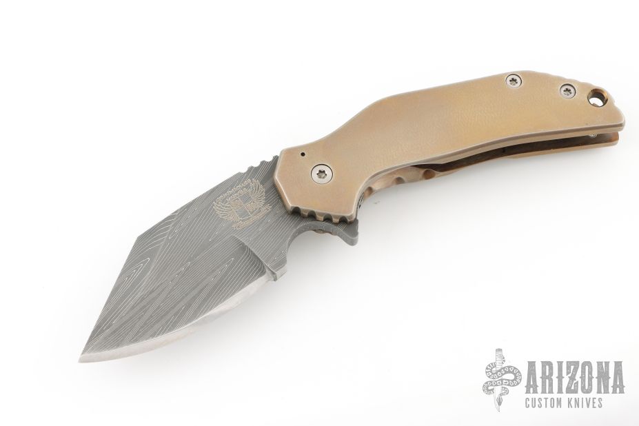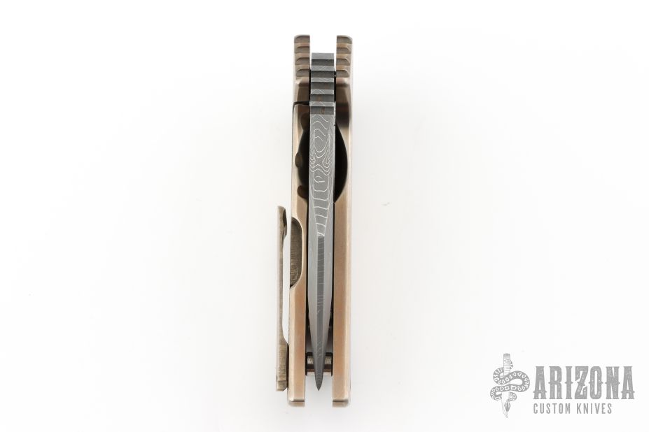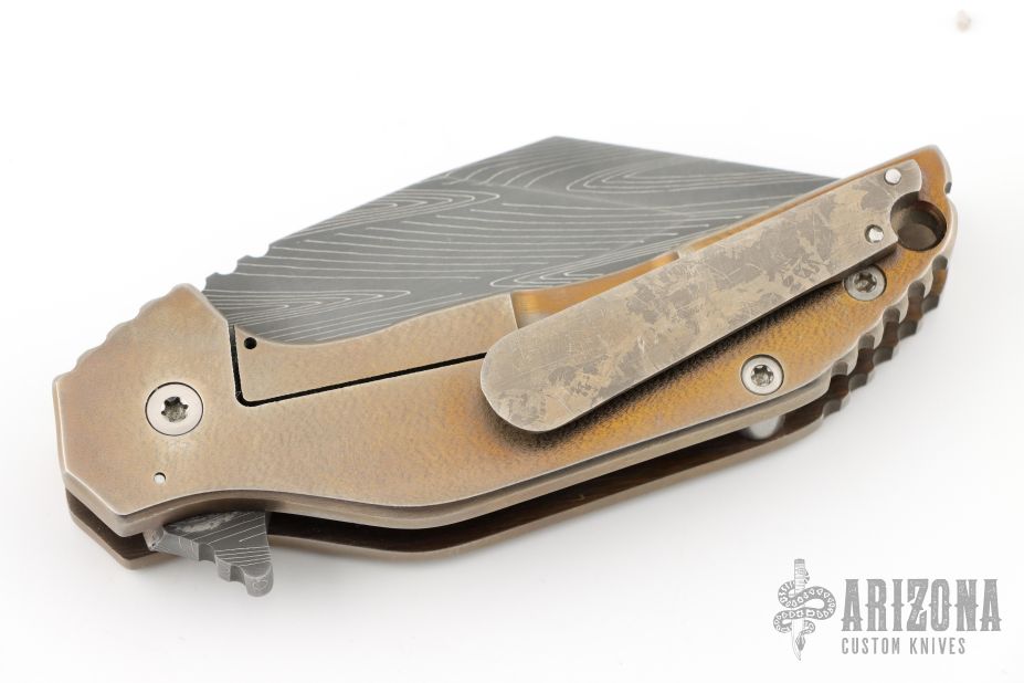This Mini FOK from Grindhouse Knives features a Damascus blade with notched thumbrest and flipper. The handle has an orange peel finished and anodized titanium frame over titanium standoffs. Crystalized Titanium tip up pocket clip. Has some light scratches, otherwise excellent condition.