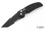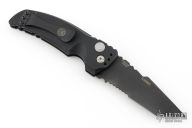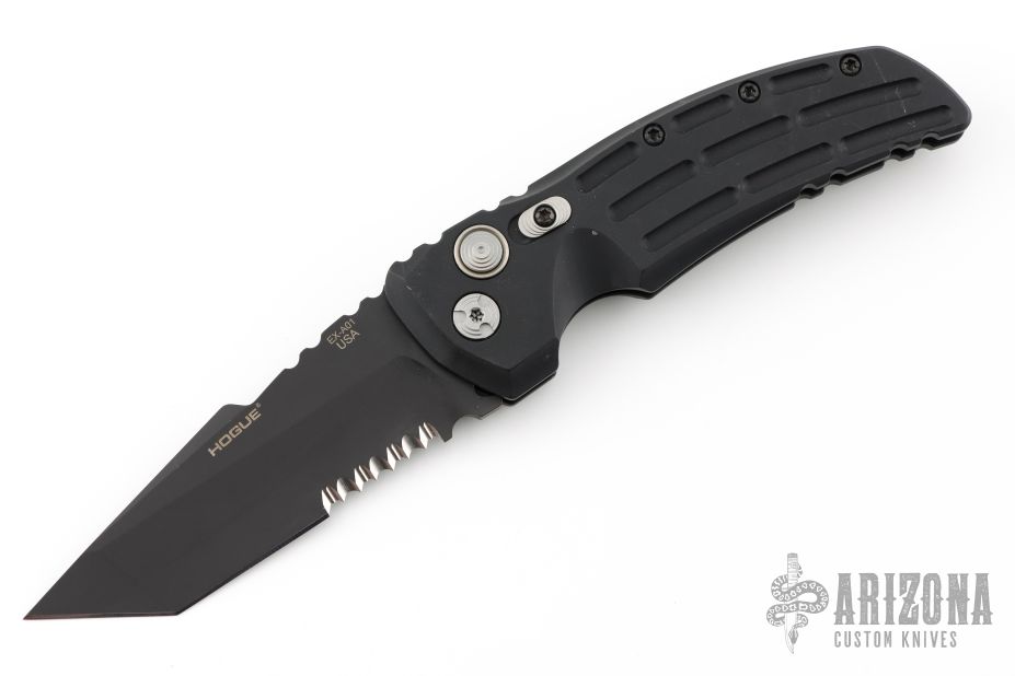 This EX-A01 by Hogue Knives is an Allen Elishewitz design, it features a black tanto partially serrated 154CM blade with notched thumbrest. The handle is black aluminum, tip up or down reversible black stainless steel clip. Has safety. Has a couple light scuffs, otherwise excellent condition.