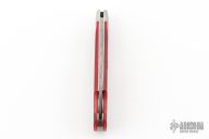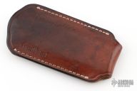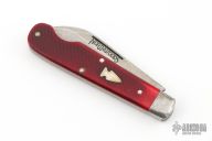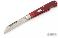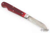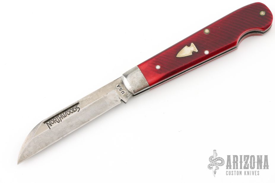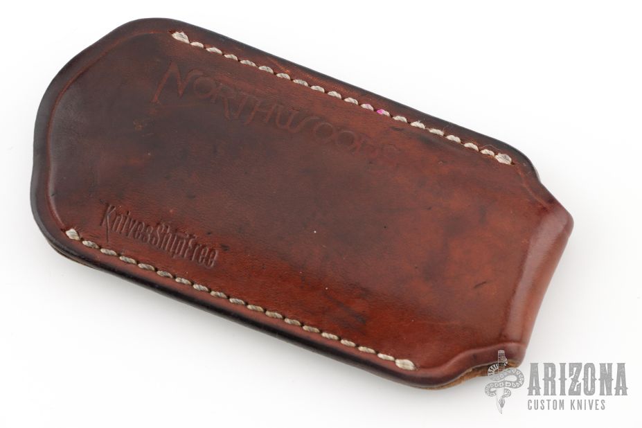 This knife from Northwoods Knives features a satin finished wharncliffe blade.  The handle has stainless bolsters, liners and shield complimented by red sawcut bone covers. Includes a brown leather slip sheath. Has scratches and patina, otherwise good condition.