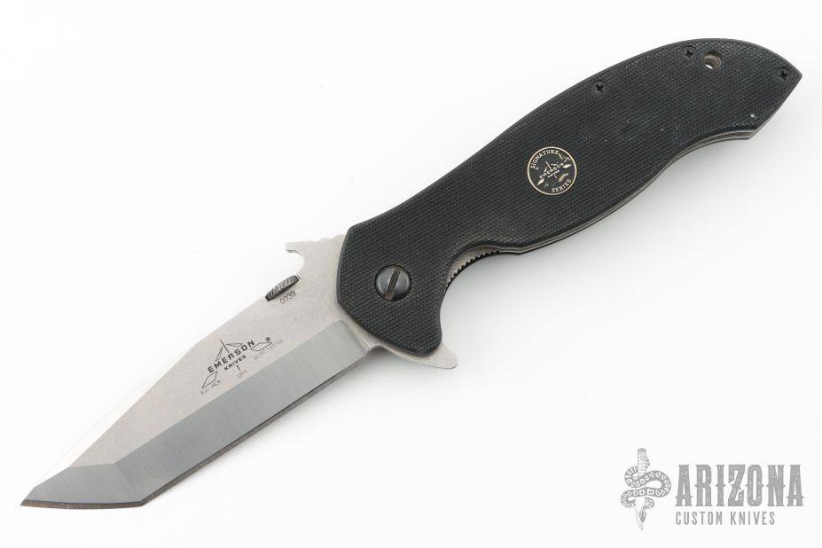 The Emerson Bulljack Flipper is the latest in the line of the Emerson Signature Series. Featuring a prominent tanto style stonewashed blade. Each blade is hand-signed by Ernest Emerson on the backside. This model features an embedded coin inside the G-10 Handle signifying it as an Emerson Signature Series Model.