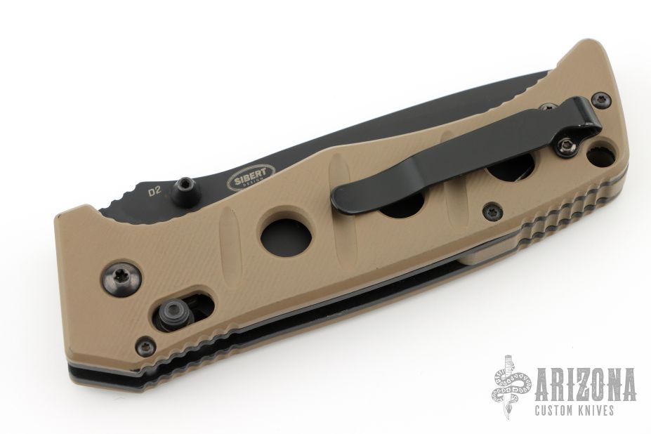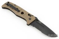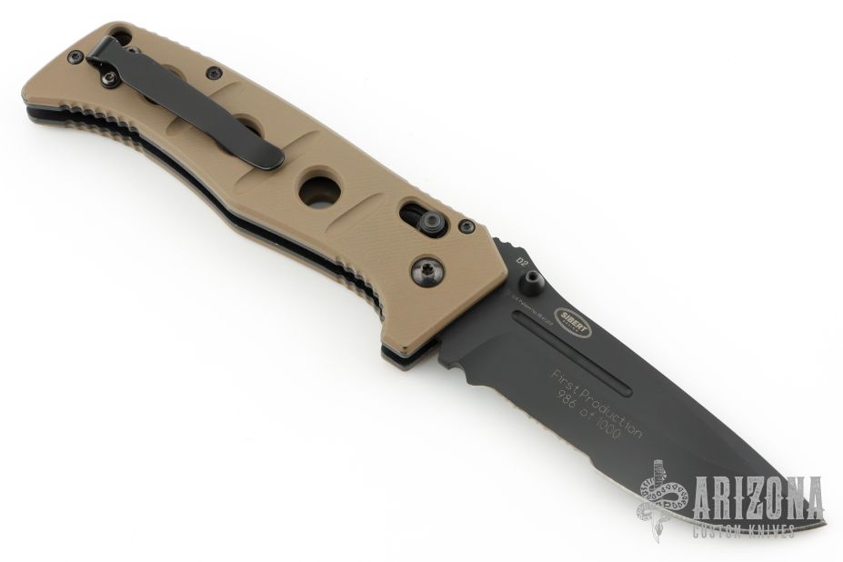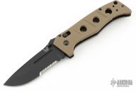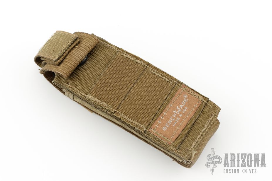 This Adamas by Benchmade is a Shane Sibert design, it has a black partially serrated blade with dual thumbstuds, fullers and notched thumbrest. The handle has FDE G-10 scales, black stainless steel liners and tip up clip. Nice lockup and blade seating. Comes with original box, papers, and nylon belt sheath. Has a couple light scuffs, excellent condition otherwise.