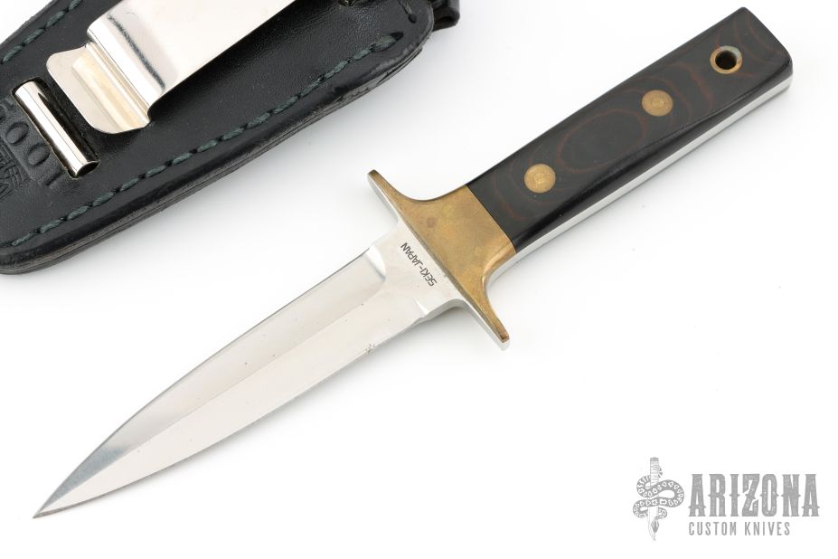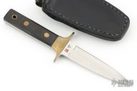 This Fang boot dagger by Al Mar Knives features a double edged satin finished blade, .134" blade stock and .740" blade depth, full tang construction. The handle has brass bolsters, pins and lanyard tube, and black paper micarta scales. Has some light scratches, has been resharpened, otherwise excellent condition. Comes with black leather boot sheath and original box and papers.
