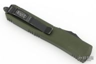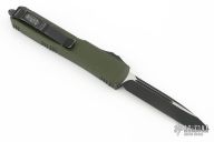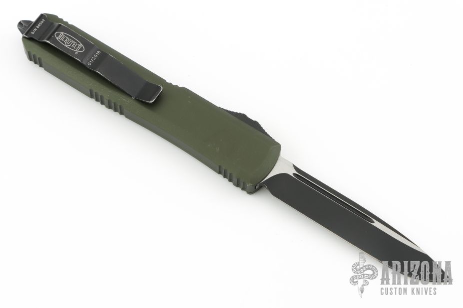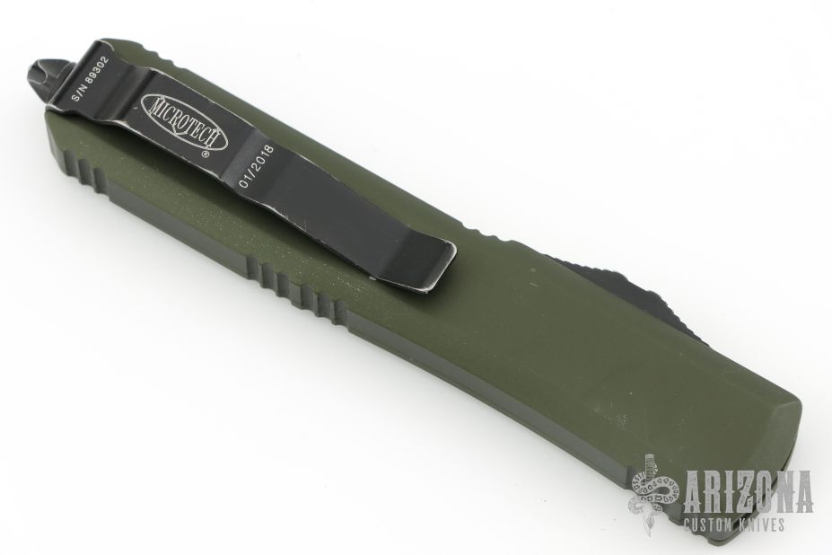This Ultratech OTF automatic by Microtech features a S/E black finished blade with a standard edge. OD Green aluminum frame with black hardware and stainless steel clip. Glass breaker. Serial number 89302 and dated 01/2018. Comes with original box and papers. Has some wear on the clip, and some scuffs, otherwise good condition.