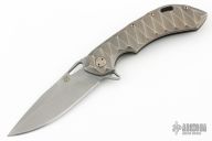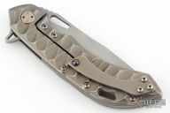 This Wayfarer 247 from Olamic Cutlery features a tumble finished spear point blade, thumbhole, notched thumbrest and flipper. The handle is stonewashed and sculpted titanium with an anodize finish titanium pocket clip is positioned for tip up carry with a ceramic ball inlay, floating titanium backspace. The Wayfarer 247 is very comfortable in the hand and flips well with no wrist action needed. Blade is centered when closed and locks up with no play. s/n 322. Comes with original zippered case and COA dated 7-6-16. Has scuffs, has been resharpened, otherwise excellent condition.