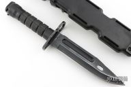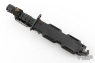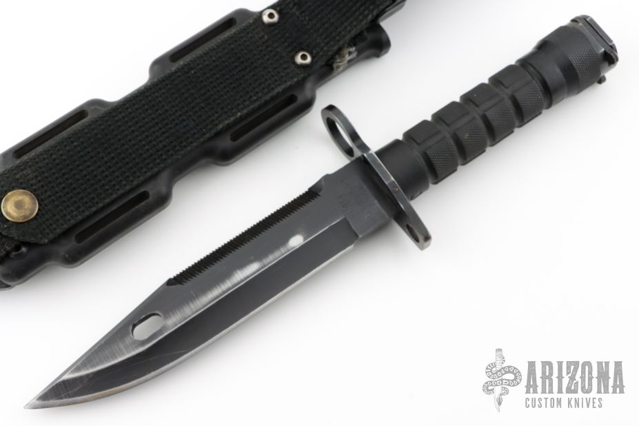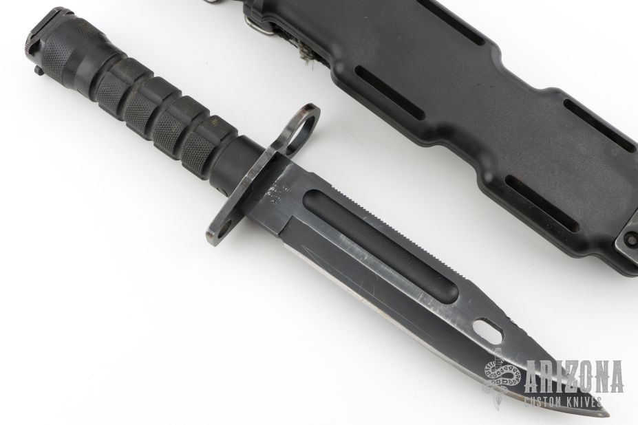 This M9 Phrobis III by Buck features a black spear point blade with sawteeth on the spine and a large fuller, .235" blade stock and 1.419" blade depth, hidden tang construction. The handle has a black steel guard and black plastic grip and can be removed from the handle for cleaning. Comes with original sheath. Has some scuffs and scratches, has been resharpened, otherwise good condition.