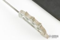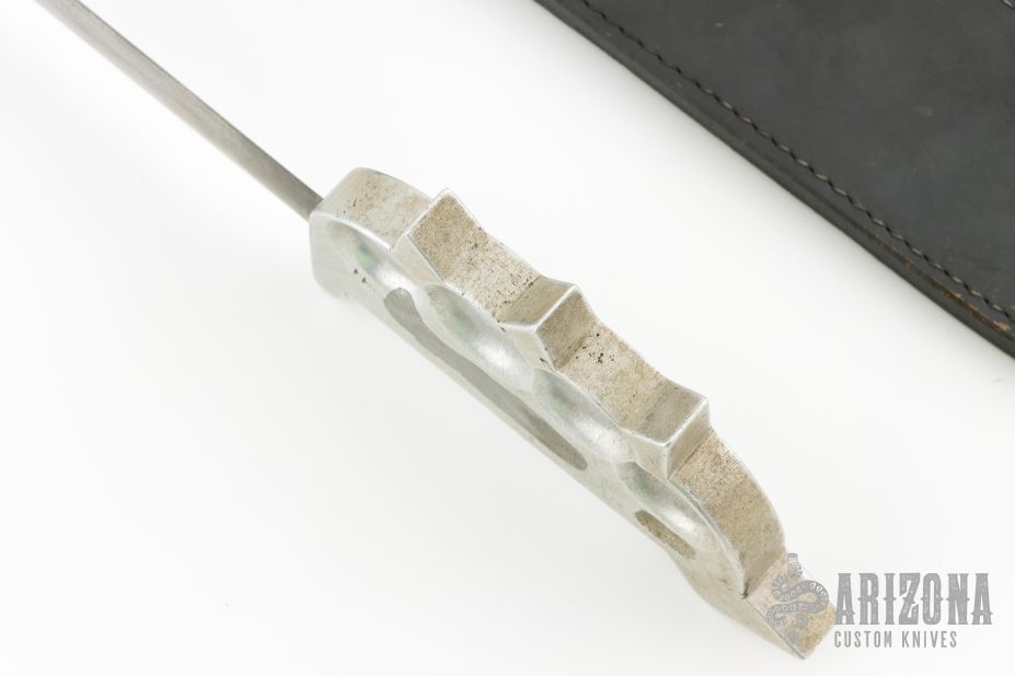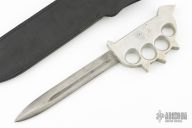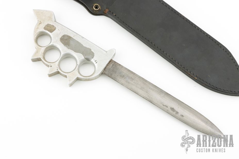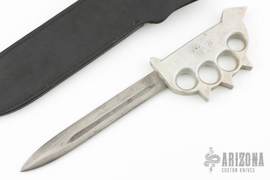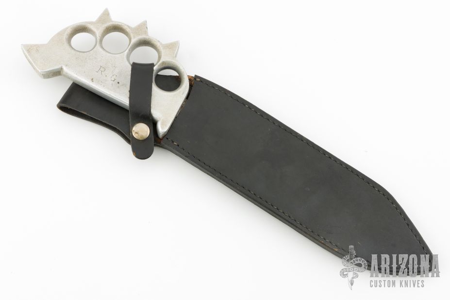 This Knuckle D-Guard Trench Knife by "R.G." features a satin finished double edged blade with a fuller, .149" blade stock and 1.075" blade depth, hidden tang construction. The handle is a set of aluminum knuckles that are stamped "R.G.". Part of the aluminum grip is filled with lead. Comes with a black leather sheath. Has some scratches and patina, otherwise good condition. Hard to say if this was a theatre-made piece or how old it is, but its pretty cool!