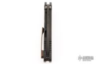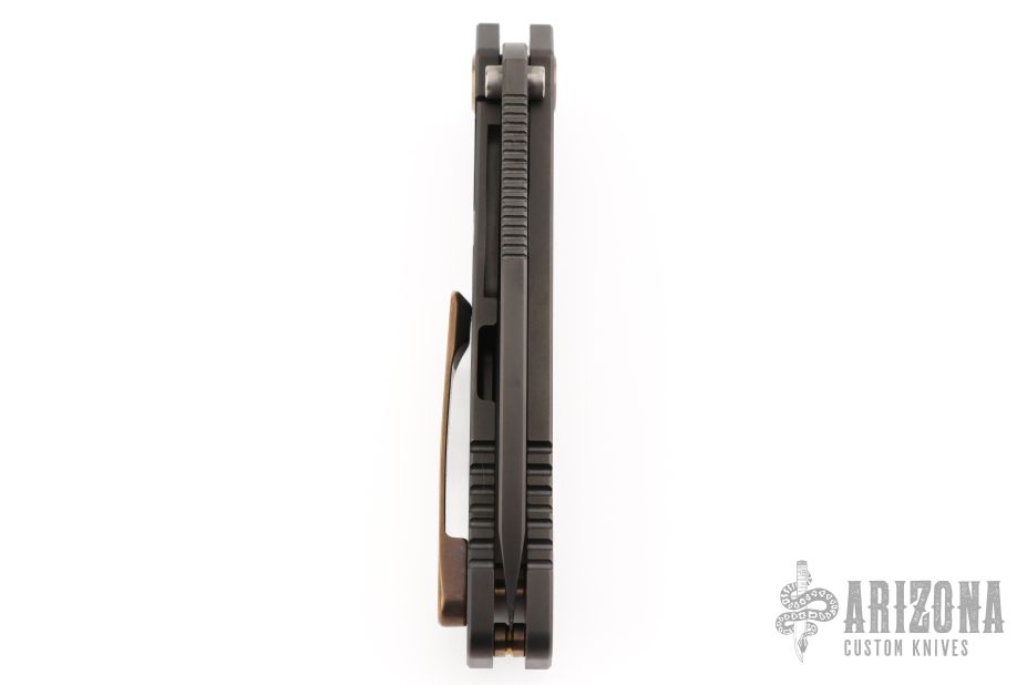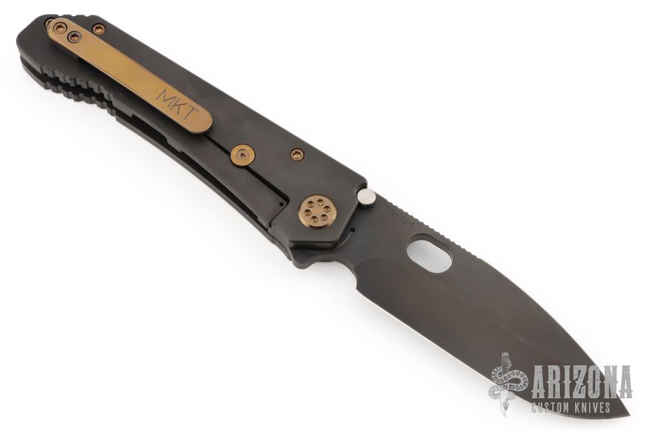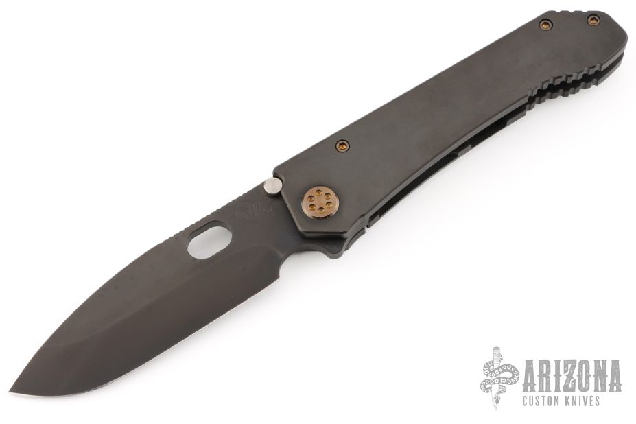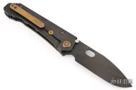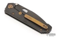 This 187 DP Drop Point by Medford Knife and Tool features a black PVD blade with notched thumbrest and thumbhole. The handle has a black pvd titanium frame and bronze clip and matching hardware. Nice blade seating, detent and lockup. Comes with original box, zipper case and papers dated 4-29-22. Excellent condition.