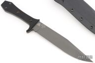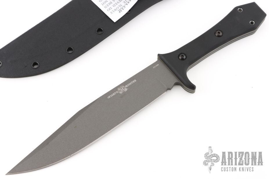 This Sandbar Bowie by Tops and Sterling F. Buster Cutlery Co. was made for Fight'n Rooster. It features a Tungsten Cerakoted blade with .181" blade stock and 1.406" blade depth, full tang construction with black G-10 scales with white liners. Comes with a kydex sheath with belt clip, and original packaging. New from maker. #23-099