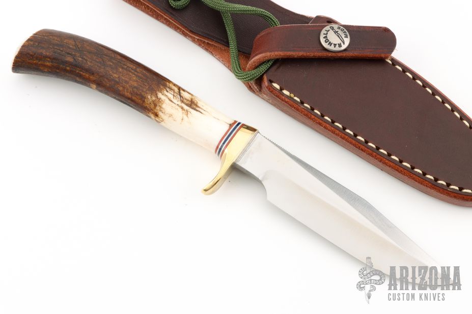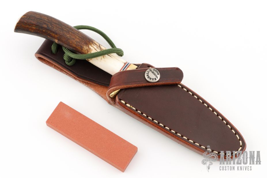 This Model 5-4 Camp and Trail by Randall Made Knives features a clip point satin finished blade with false top edge and a notched thumbrest, .167" blade stock, .958" blade depth, hidden tang construction. The handle has a brass guard and stag grip with red/white/blue spacers. Includes a brown leather sheath, sharpening stone and original paper wrapping. New from maker.