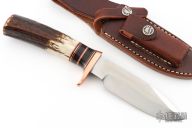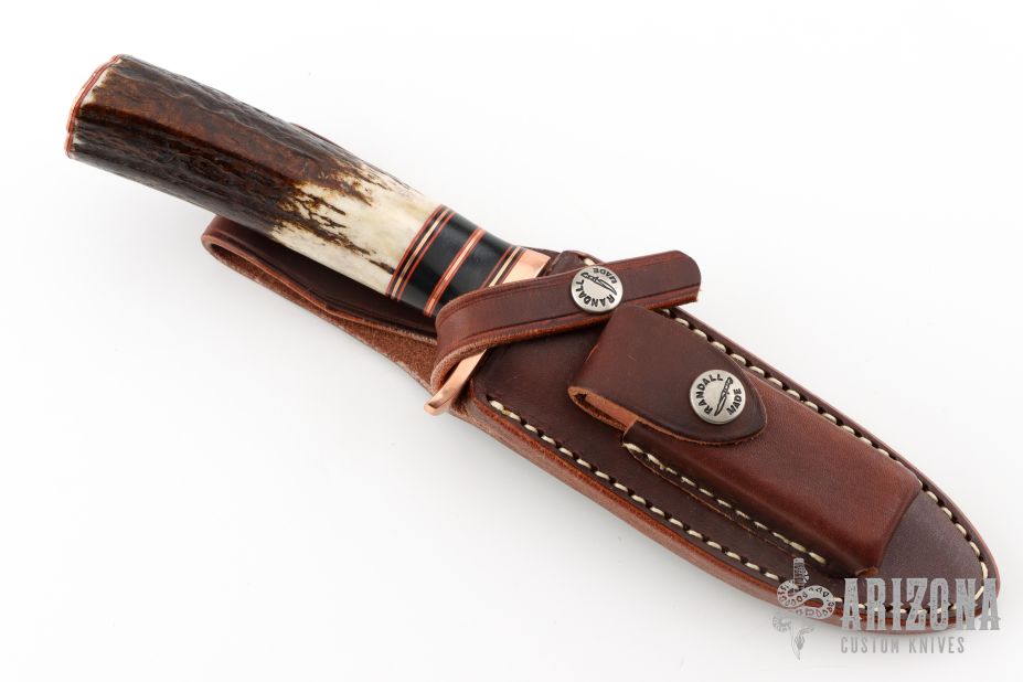 This Copper Companion by Randall Made Knives features a stainless steel blade, .177" blade stock, 1.297" blade depth. 1.5" sharpened top edge and notched thumbrest, hidden tang construction. The handle has a copper guard and butt plate, stag grip and red/black/copper/black linen micarta spacer pattern. Comes with brown leather sheath and original paper wrapping. New from maker!