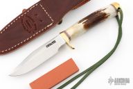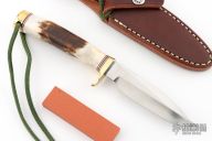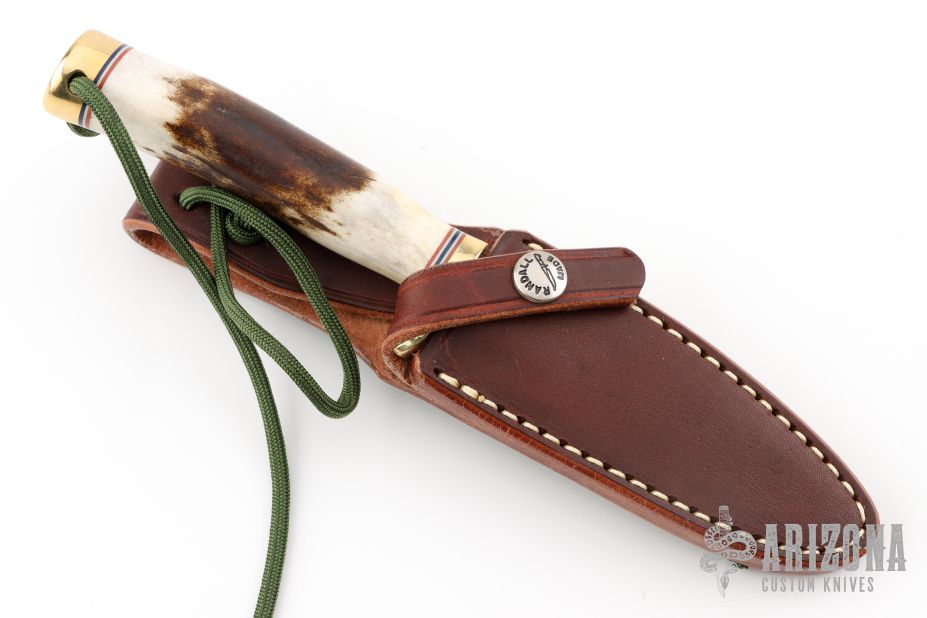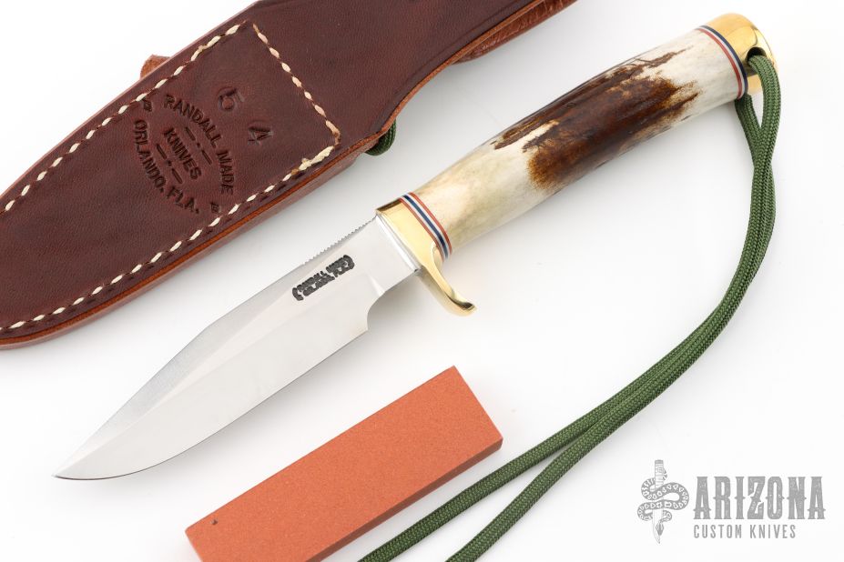 This Model 5-4 Camp and Trail by Randall Made Knives features a clip point satin finished blade with false top edge and a notched thumbrest, .157" blade stock, .948" blade depth, hidden tang construction. The handle has a brass guard and butt with lanyard hole, stag grip with red/white/blue spacers. Includes a brown leather sheath, sharpening stone and original paper wrapping. New from maker.