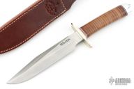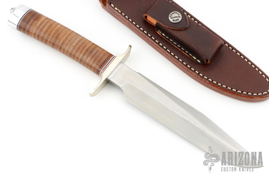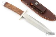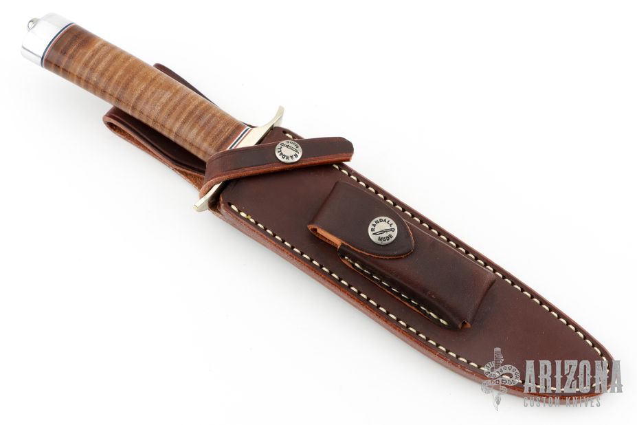 "The Model 1 by Randall Made Knives was made famous by Allied combat troops in World War II and has since been widely used in all theaters of war." This knife features a satin finished blade with a sharpened top edge, .231" blade stock and 1.263" blade depth, hidden tang construction. Nickel silver guard, stacked leather handle with red/white/blue spacers, and a duralumin butt cap. Includes a brown leather sheath and original paper wrapping. New from maker!