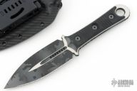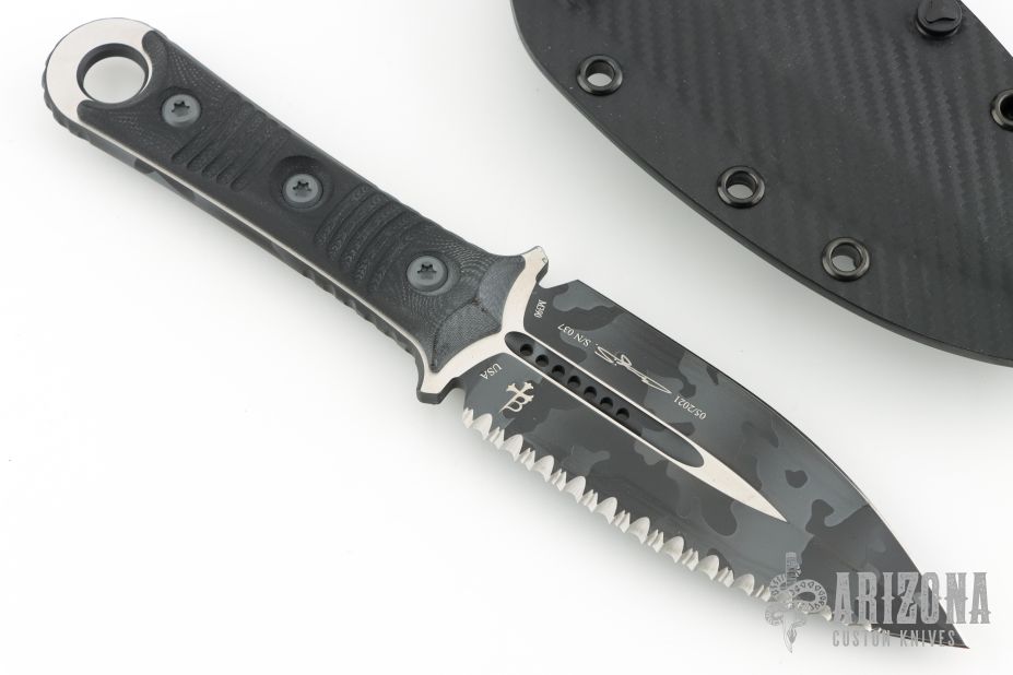This SBD by Microtech Knives and Borka Blades features an Urban Stripe Camo finished double-edged blade with one fully serrated edge, .192" blade stock and 1.607" blade depth, full tang construction with black G-10 scales. Comes with the original kydex sheath, box and papers, dated 05/2021 s/n 037. Excellent condition. Also comes with a black leather sheath by Chattanooga Leatherworks.