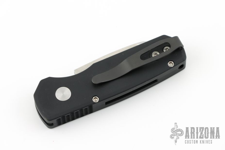 This Runt 5 by Pro-Tech features a mirror polished stonewashed blade with satin finished flats.  The handle features a black aluminum frame, a black stainless steel tip up pocket clip and an abalone inlaid push button. Comes with original box, pouch, and papers. Has a couple light scuffs, otherwise Excellent condition.