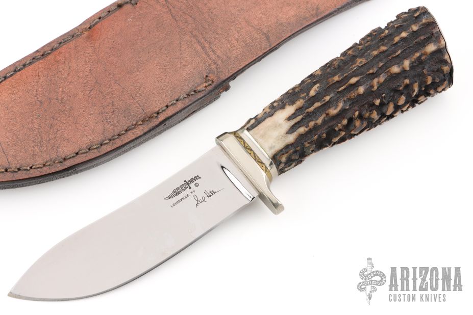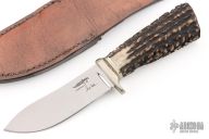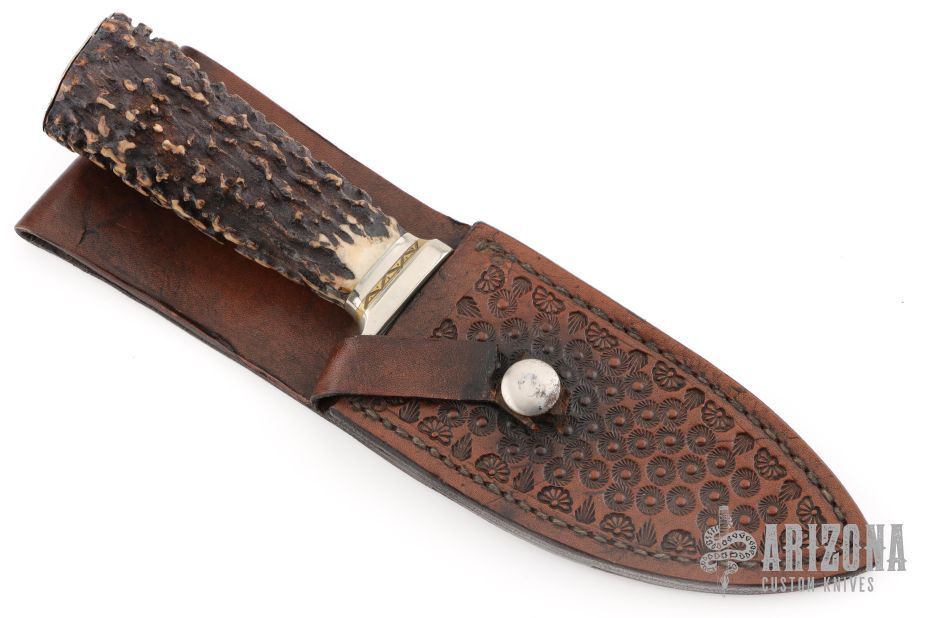 This Skinner by Gil Hibben features a mirror polished blade with notched thumbrest, .175" blade stock and 1.179" blade depth, hidden tang construction. The handle has a nickel silver guard and stag grip handle with nickel silver pommel and black and engraved brass spacers. Includes a hand tooled brown leather sheath with belt loop and zipper case. Has a couple very light scratches, otherwise excellent condition.