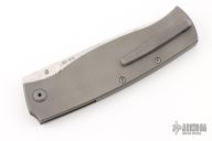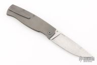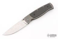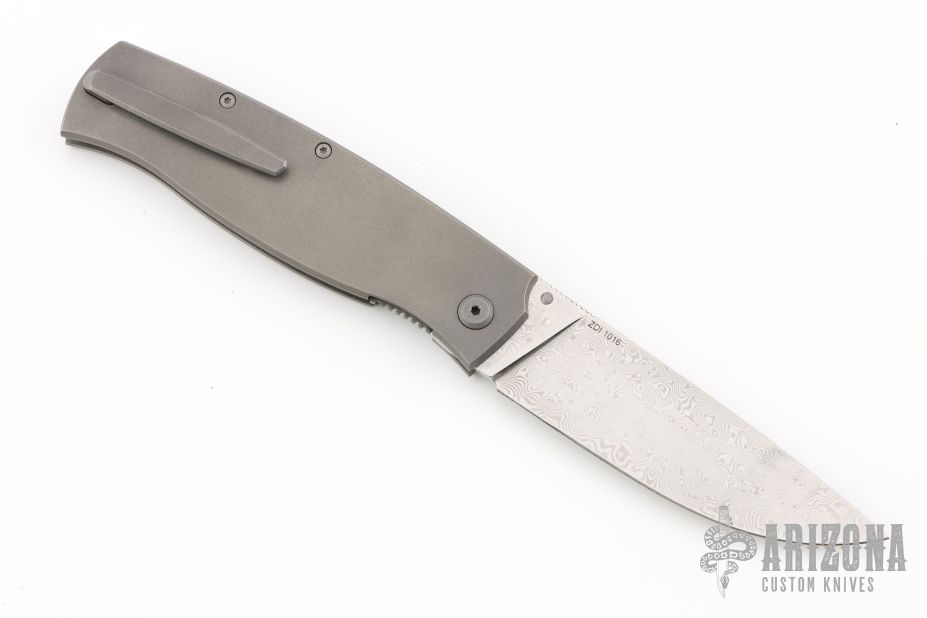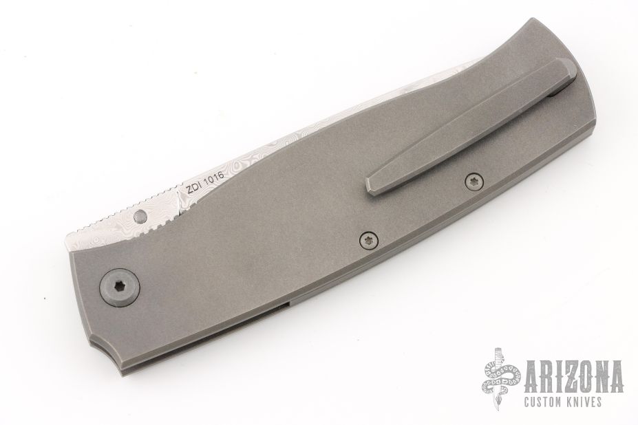 This Strizh by Alexander Cheberkov features a ZDI 1015 Damascus drop point blade with single thumbstud. The handle has a stonewashed titanium frame with blasted hardware and inlaid liner, matching backspacer and tip up clip with hidden screws, carbon fiber overlay. Comes with original box and papers. Excellent condition.