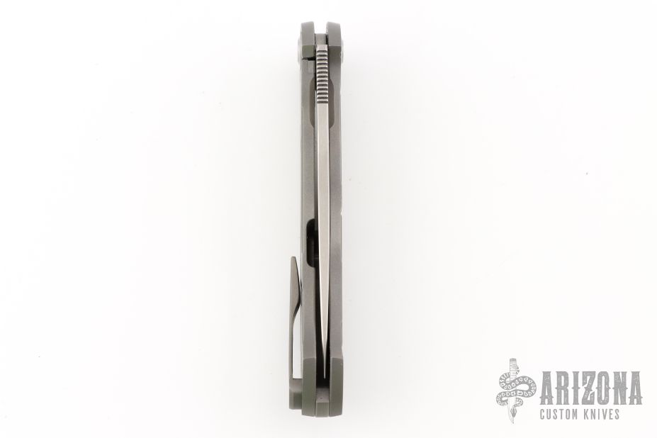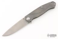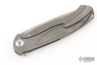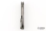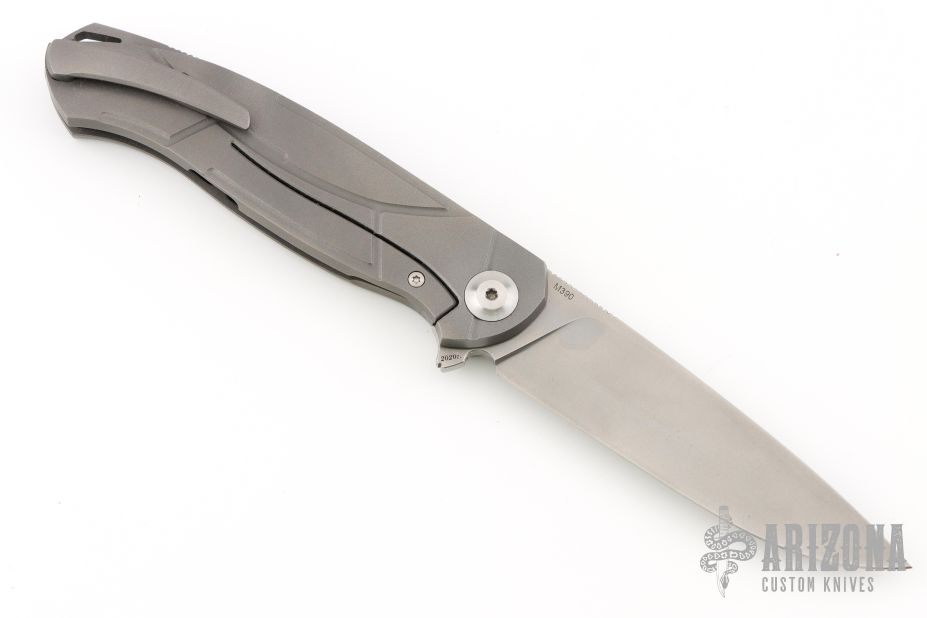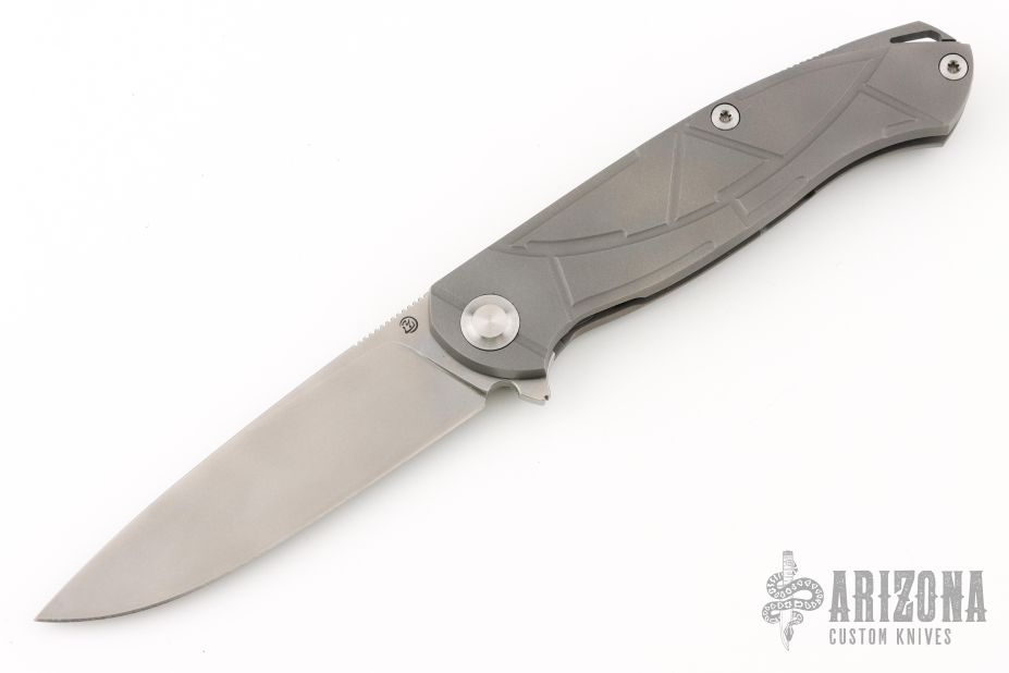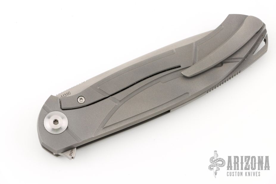 This Scout by Alexander Cheburkov features a matte finished blade with notched thumbrest and flipper. The handle has a milled and bead blasted titanium frame with matching tip up clip and backspacer with lanyard hole. Clip has hidden screws. Rides on bearings, nice detent, lockup and blade seating. Comes with original box and COA. Excellent condition. Dated 2020.