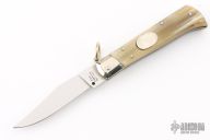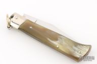 This Ringpull Auto by AGA Campolin features a mirror polished blade. The handle has nickel silver bolsters, honey horn scales, brass liners and stainless steel backspacer. Has a ring pull. Has a couple light scratches, otherwise excellent condition. Dated 1947-2007