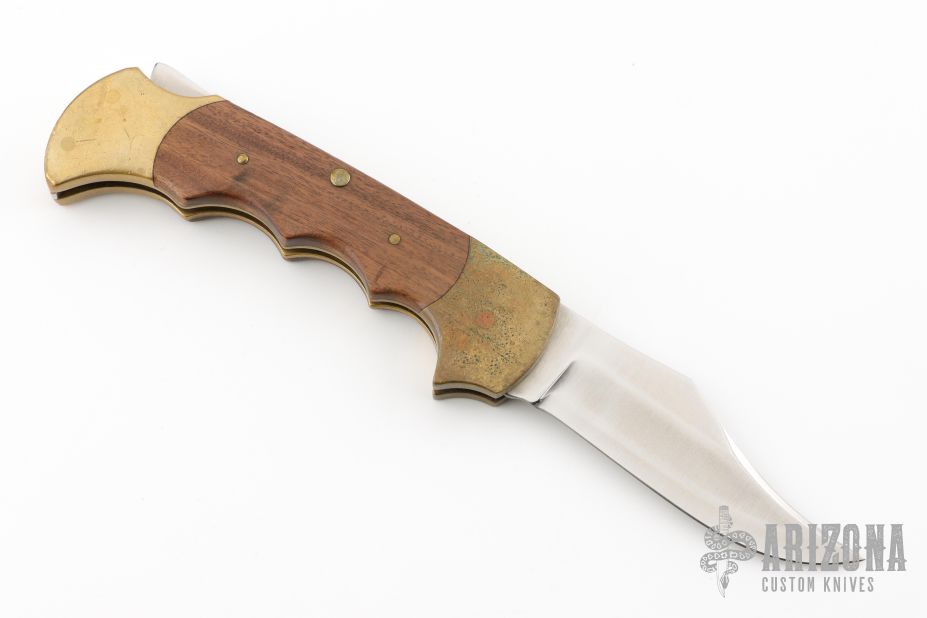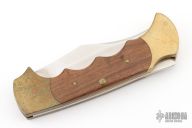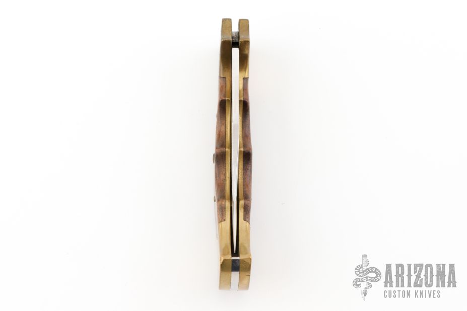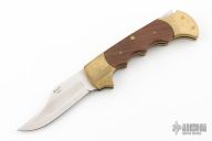 This lockback by Rigid Knives features a satin finished blade. The handle has a brass frame with rosewood inlays and a stainless steel backspacer. Nice lockup. Has some patina and scratches, otherwise good condition.