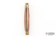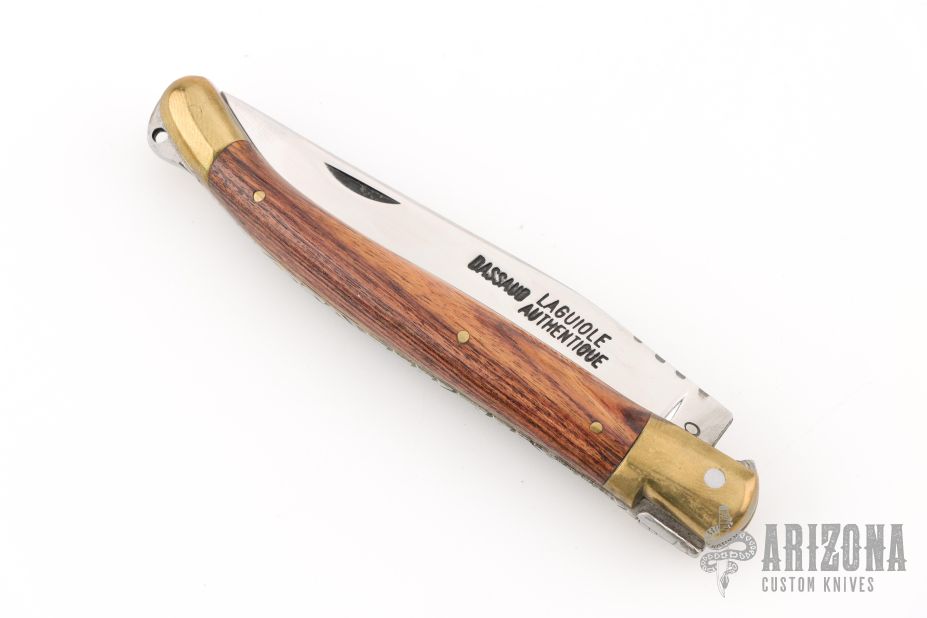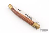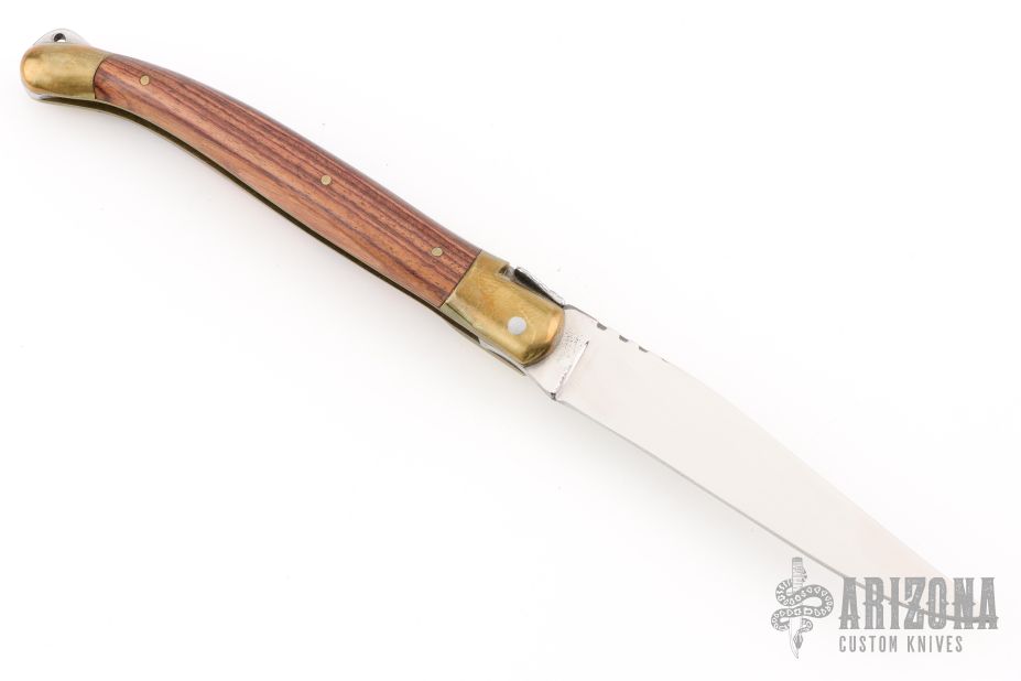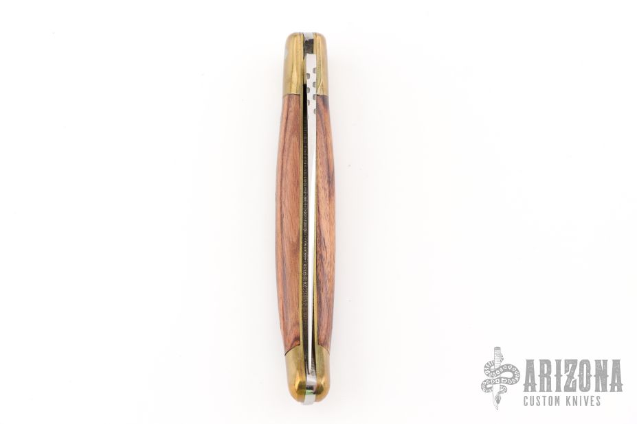This knife features a polished finished clip point blade with a nail nick. The handle features brass bolsters/liners over a steel backspring and wood covers. Fileworked backspring. Has some scuffs and patina. Great condition otherwise.