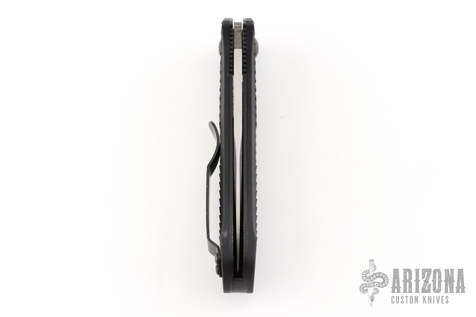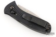This Presidio Auto has a matte finished blade. Handle is contoured black anodized aluminum with black backspacer, safety, and black stainless steel tip up (RH/LH) clip. Has a couple light scuffs, otherwise excellent condition.