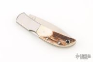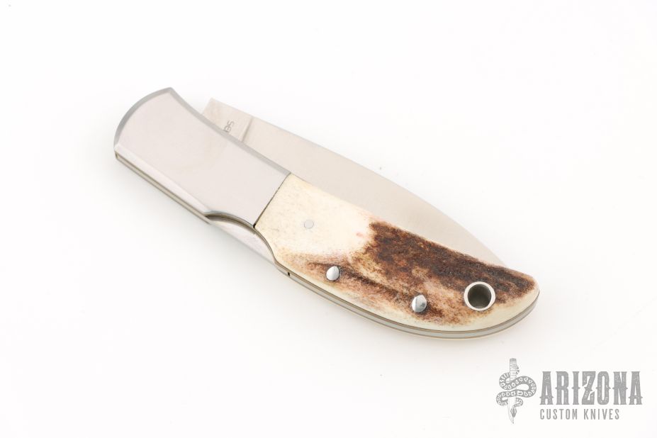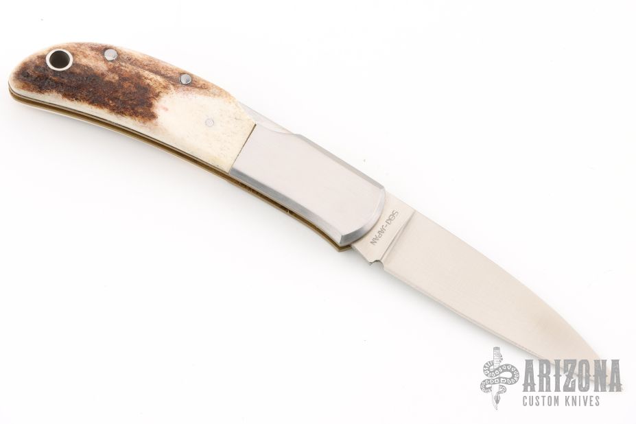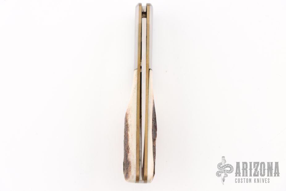 This Falcon by Al Mar features a polish finished blade with nail nick. The handle has stainless bolsters, stag covers, brass liners, stainless steel backspacer. Has some light scratches, excellent condition otherwise.