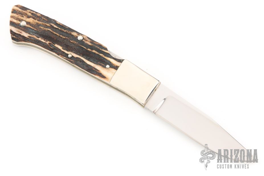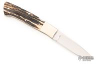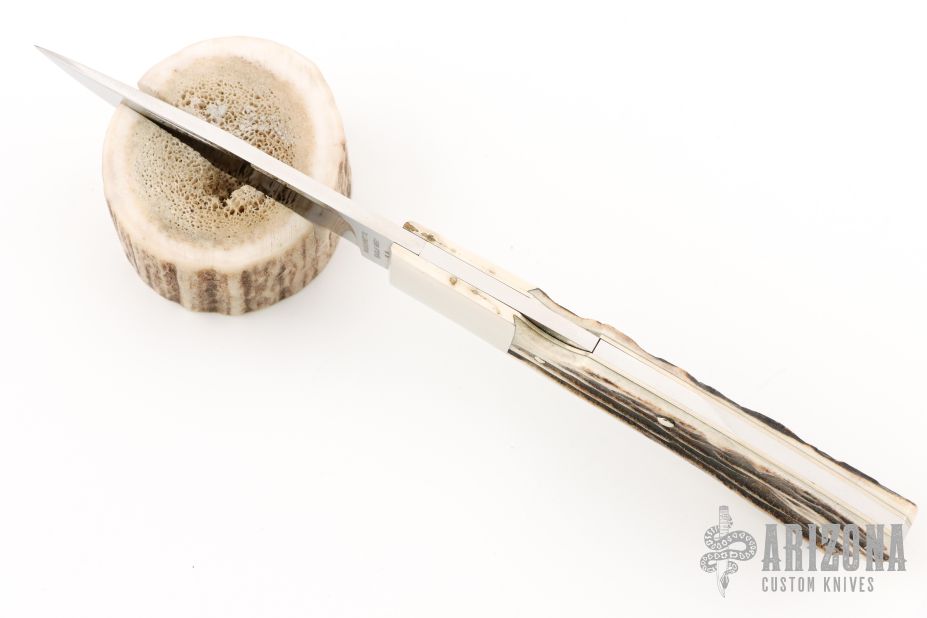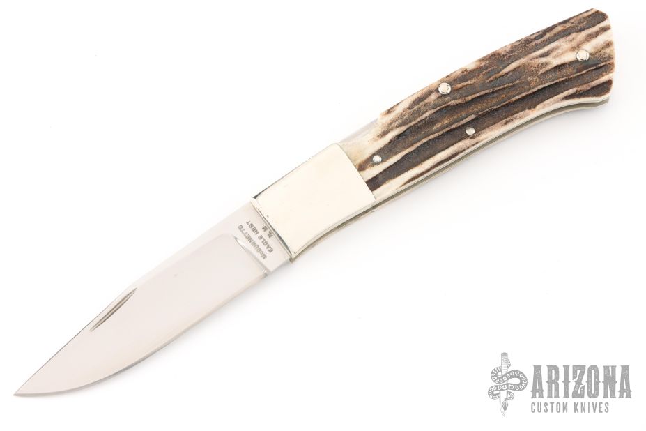 This Midlock folder by Harvey Otis McBurnette features a mirror polished clip point blade with nail nick. The handle has polished nickel silver dovetailed bolsters, stag covers, brass liners, stainless steel backspacer. Excellent fit and finish. Comes with leather slip. Has some scuffs and scratches, otherwise great condition.
