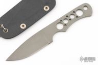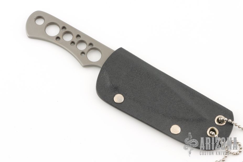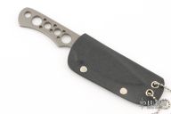 This Neck Knife from Pat and Wes Crawford features a bead blast finishd blade with .141" blade stock and .959" blade depth. Handle has been drilled to reduce weight for ease of carry. Includes kydex sheath. Has some scuffs, excellent condition otherwise.