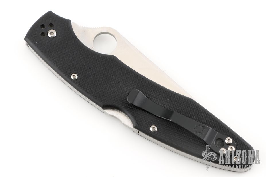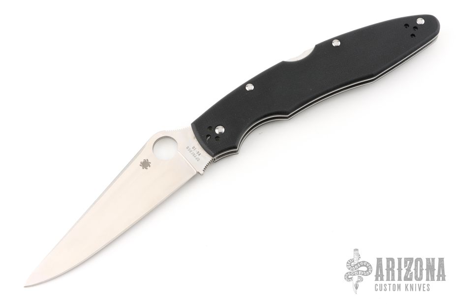 This C07GP3 Police from Spyderco features a satin finished clip point blade with swedge, thumb hole and notched thumb ramp. The handle is comprised of black G10 scales over steel liners and backspacer. The black coated steel deep carry pocket clip is 4 way adjustable. Excellent condition.